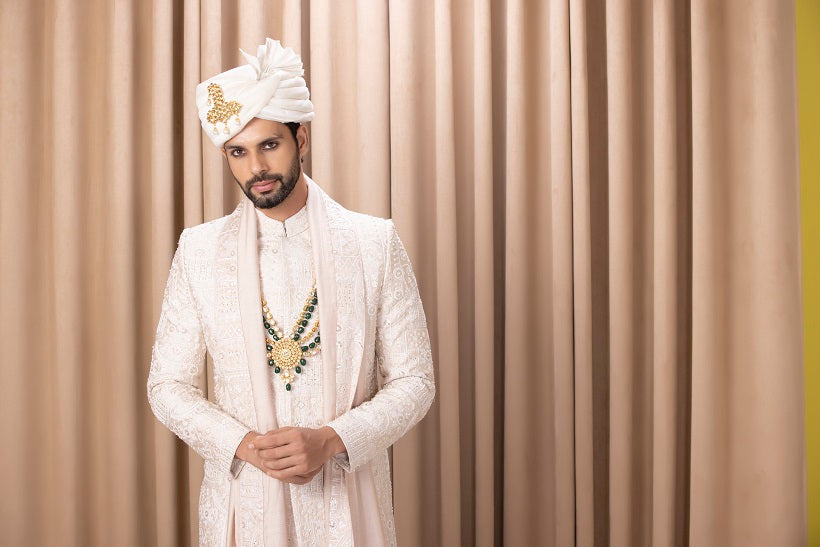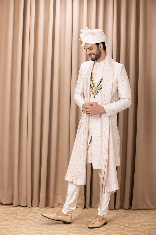 | Featuring a traditional hand embroidered powder pink sherwani with intricate detailings. Perfect for a classy wedding. This comes with a powder pink cotton silk kurta, powder pink embroidered stole and churidaar. |