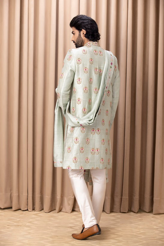 | Featuring a traditional hand embroidered mint green sherwani with intricate detailings. Perfect for a classy wedding. This comes with an ivory cotton silk kurta and ivory churidaar. |