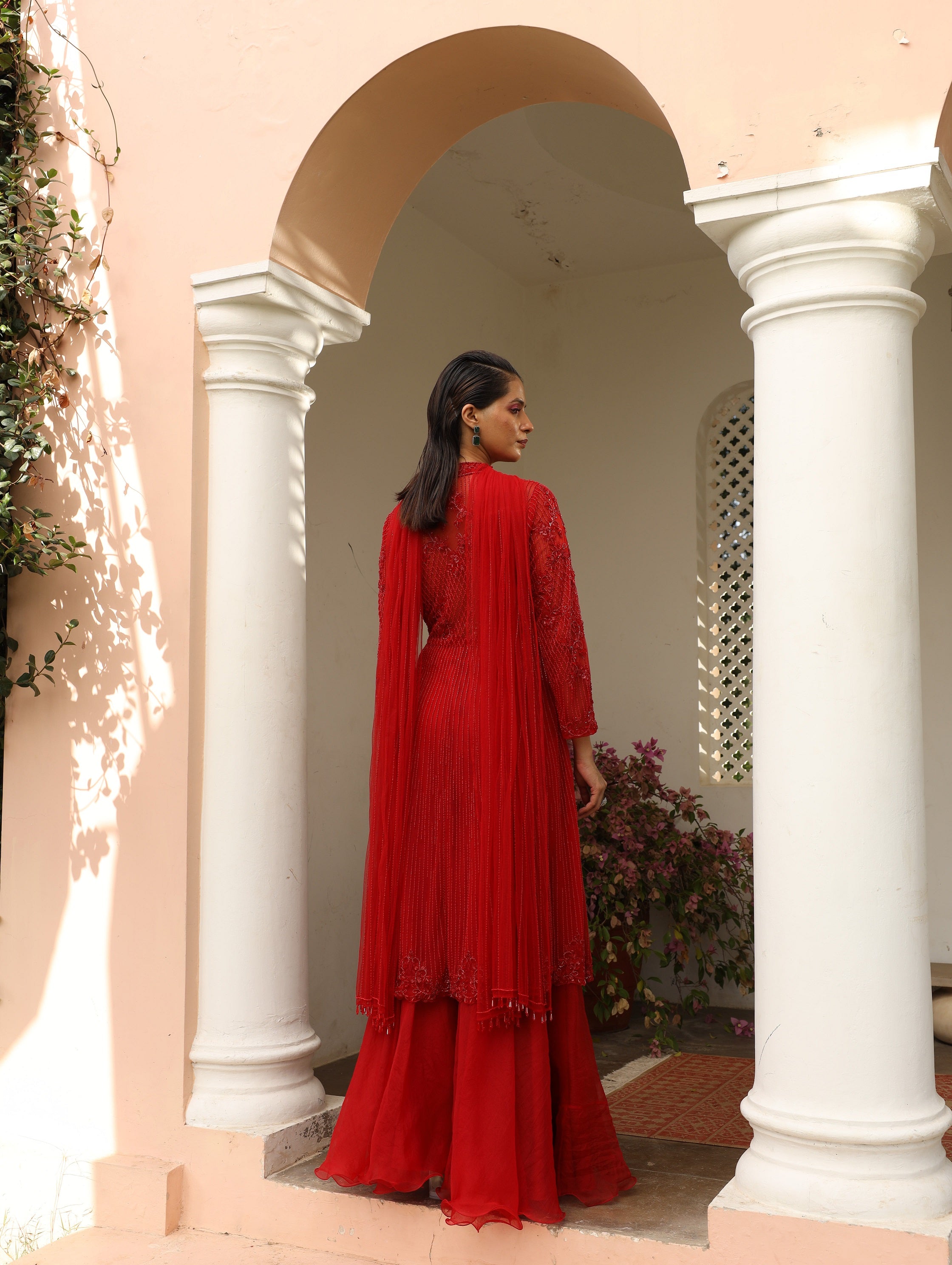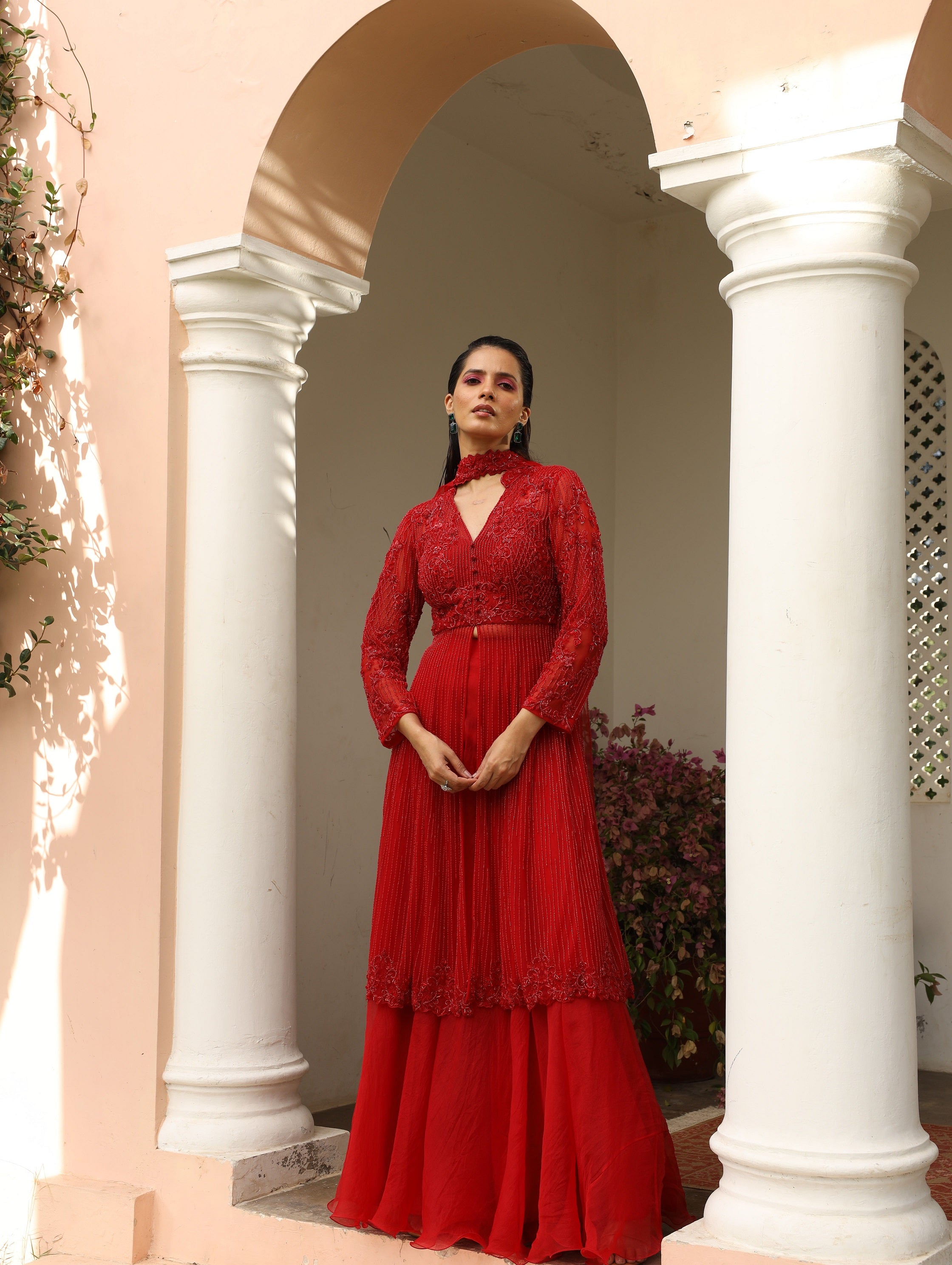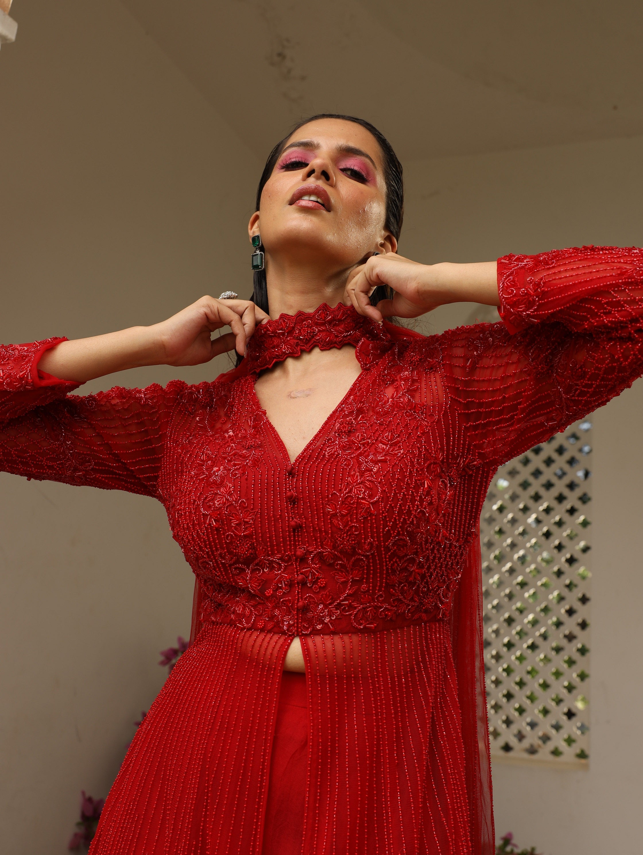 | Embroidered short shirt with sharara. Our ruby red sharara and shirt is hand embroidered.Embellished with embroidered and bead work. |