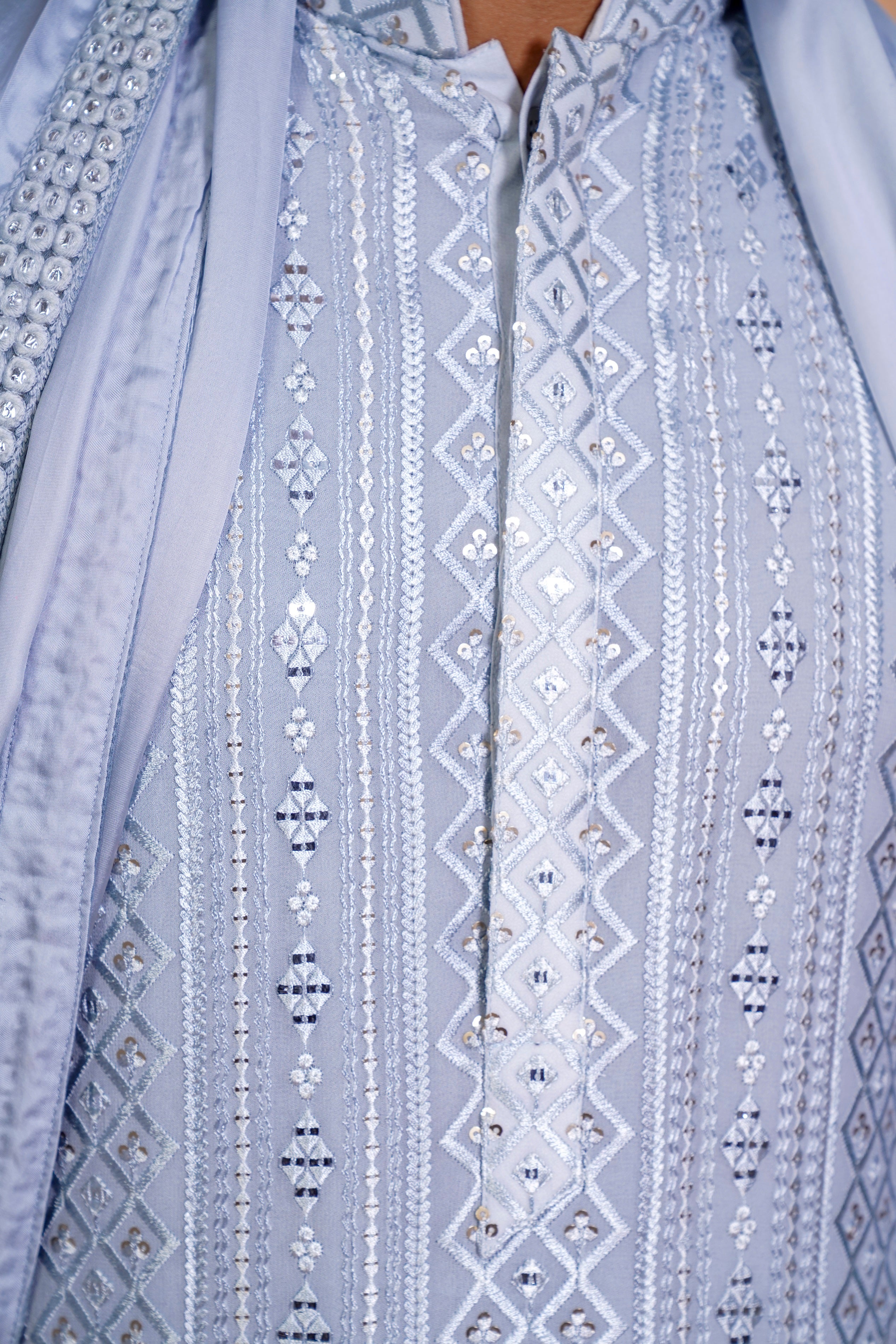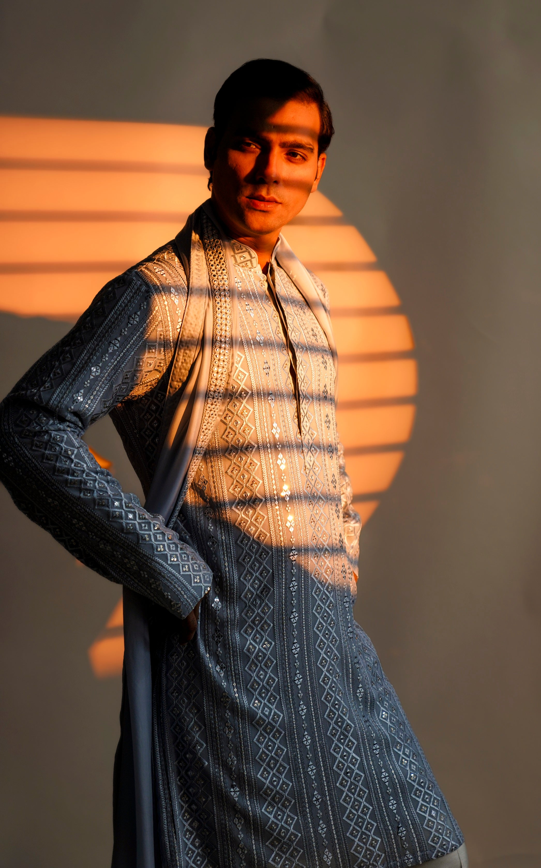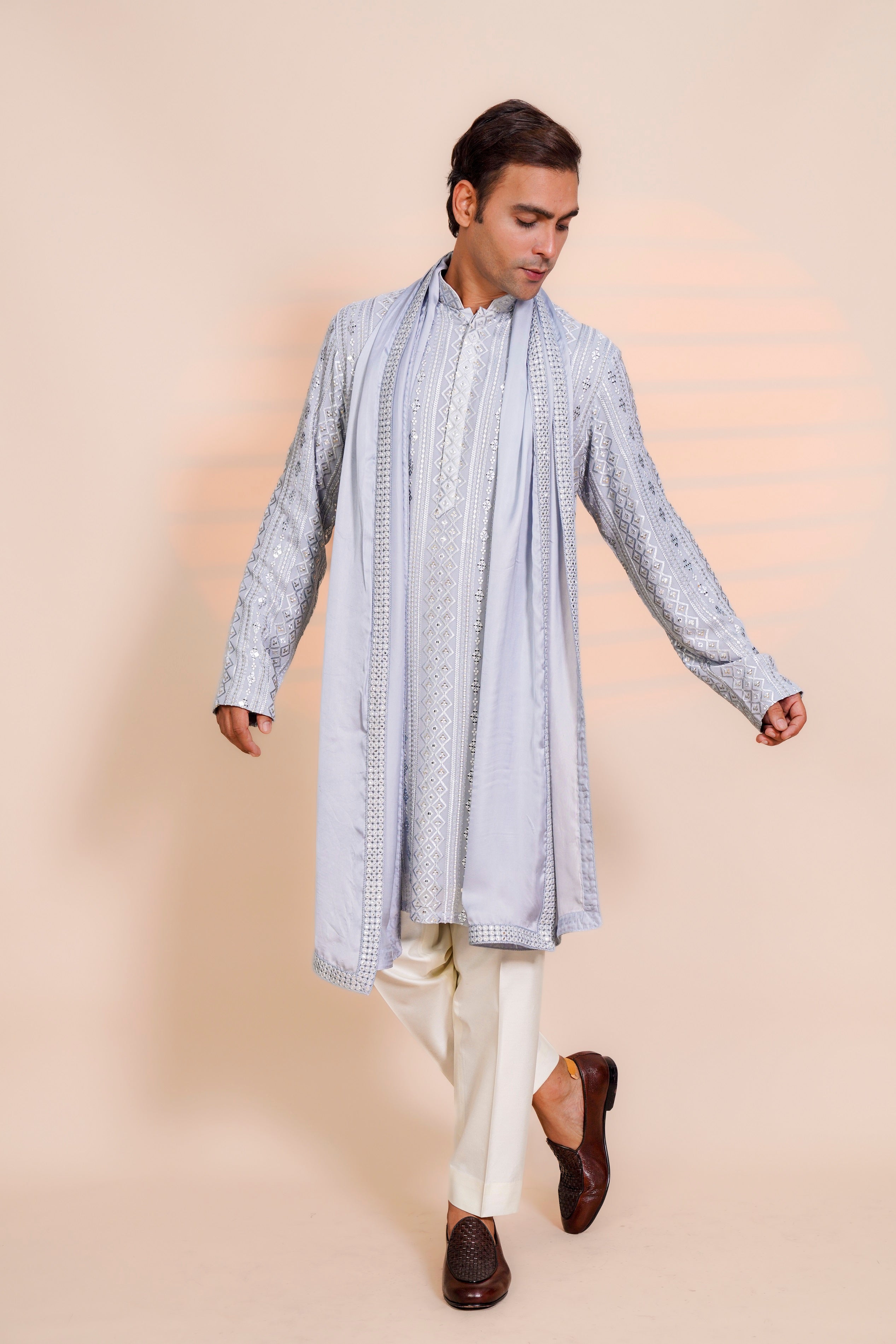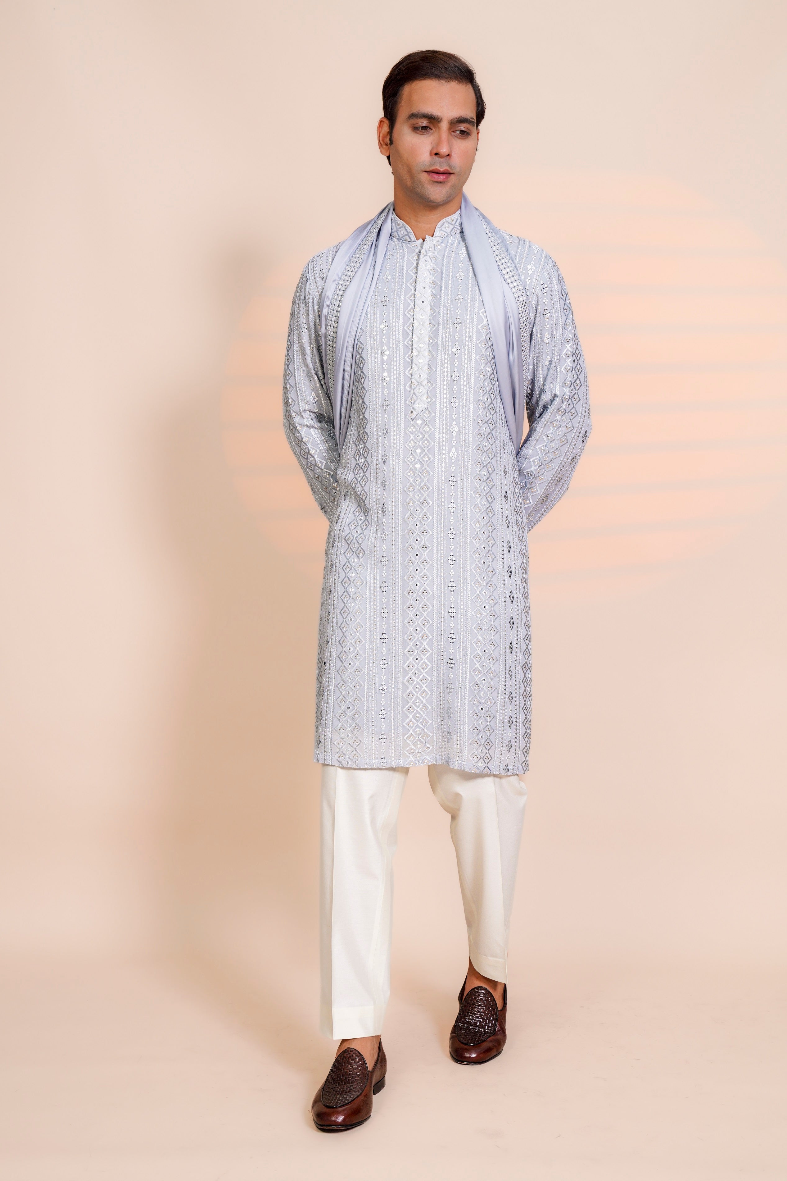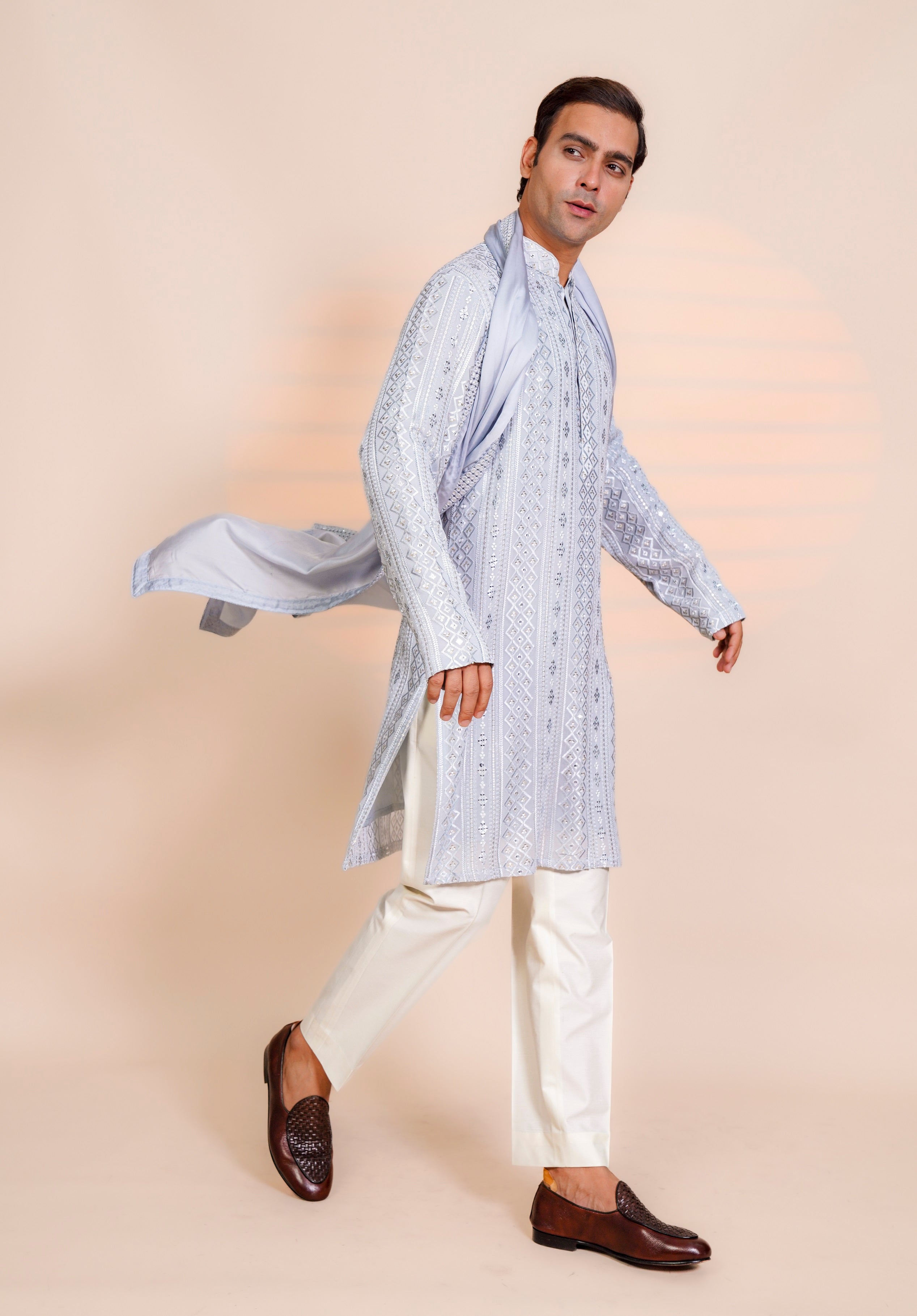 | Featuring the Grey colour chickenkari kurta set it is paired with Pajama and lace finished Stole |