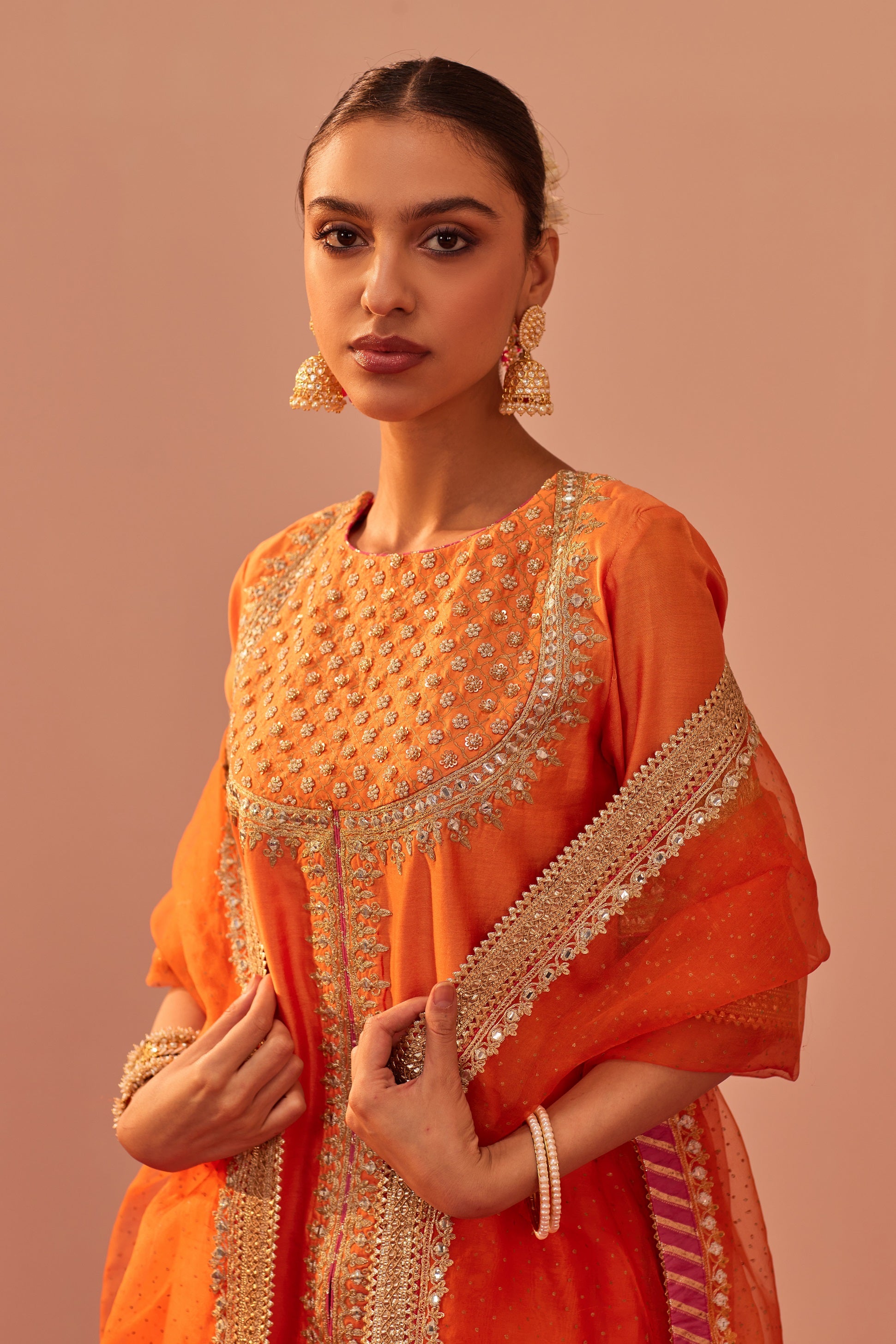 | This ensemble is made in pure silk chanderi and is teamed up with a delicate silk organza dupatta. The kurta has a zero neck with elbow sleeves. The outfit is adorned with a signature block print highlighted with tilla and patra embroidery. It is finished with a pure benarsi fabric and gota detailing. |