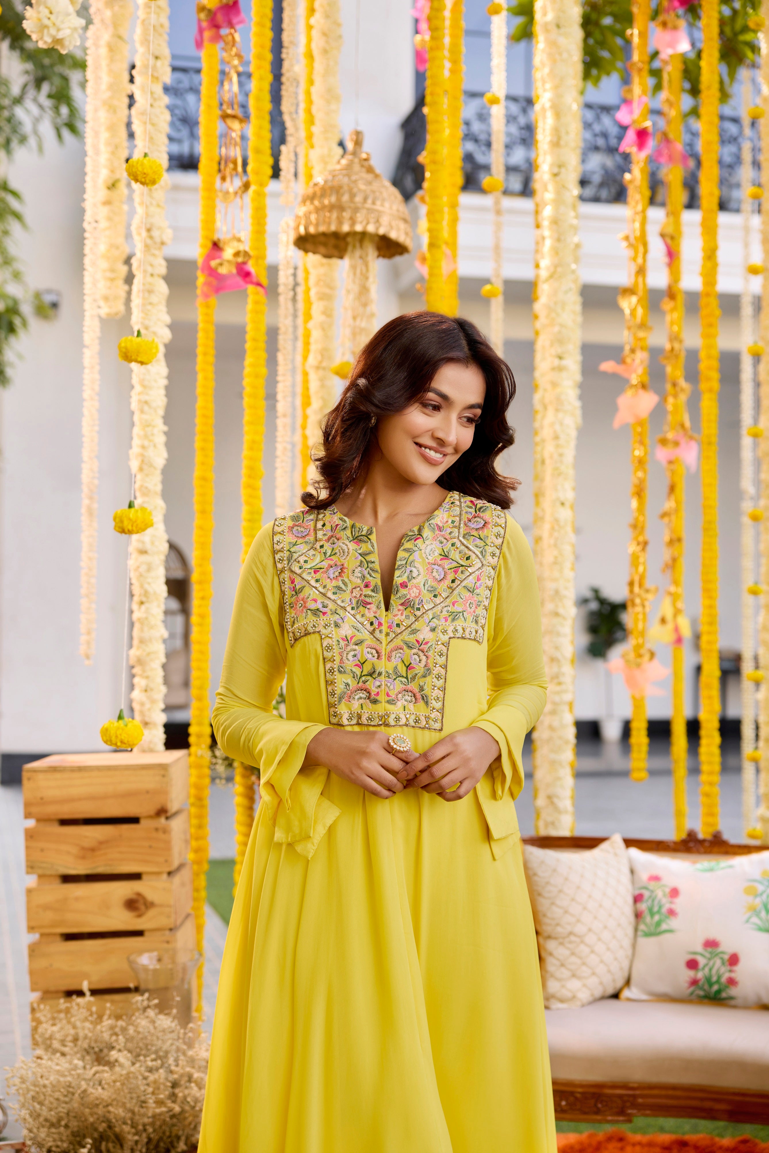 sunshine yellow asymmetric biased kurta with colorful threads embroidered yoke, it has a double cuff detailing at the wrist. It is paired with matching straight pants in georgette.