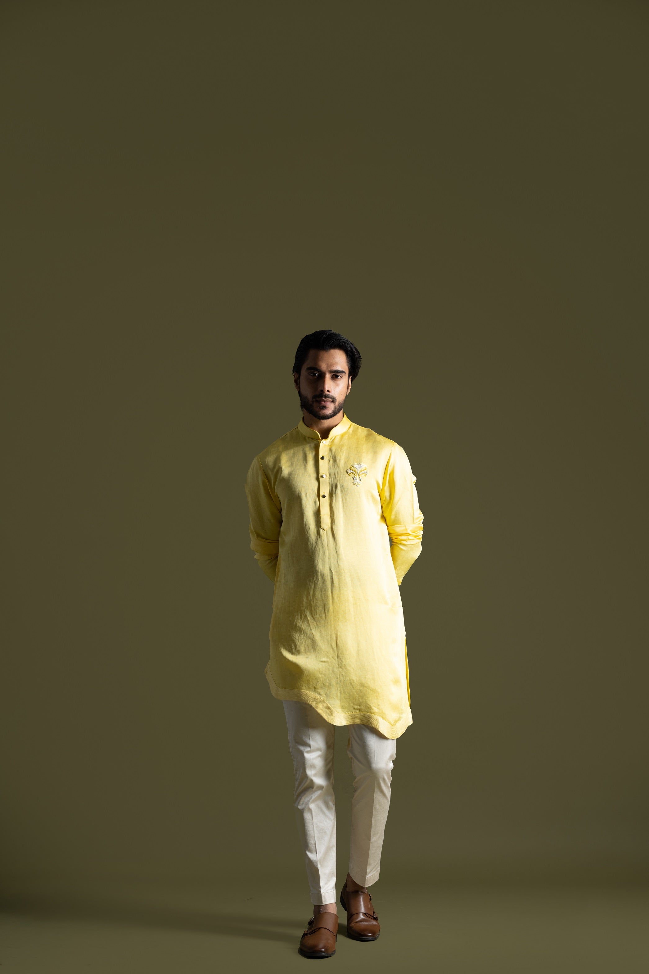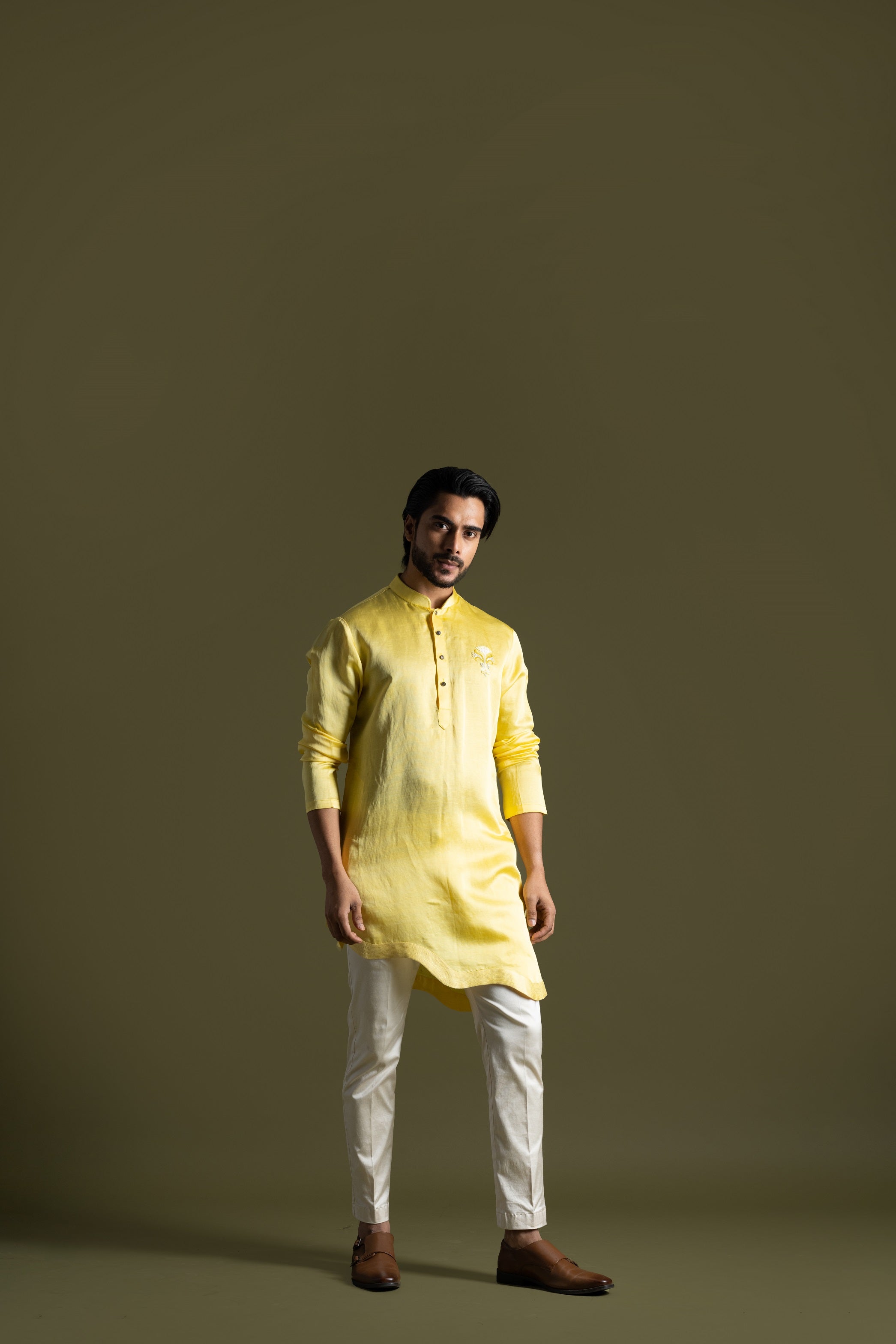 | SUNSHINE YELLOW KURTA IN LINEN SATIN WITH A WAVY HEMLINE AND A MOTIF HIGHLIGHT ON THE CHEST |