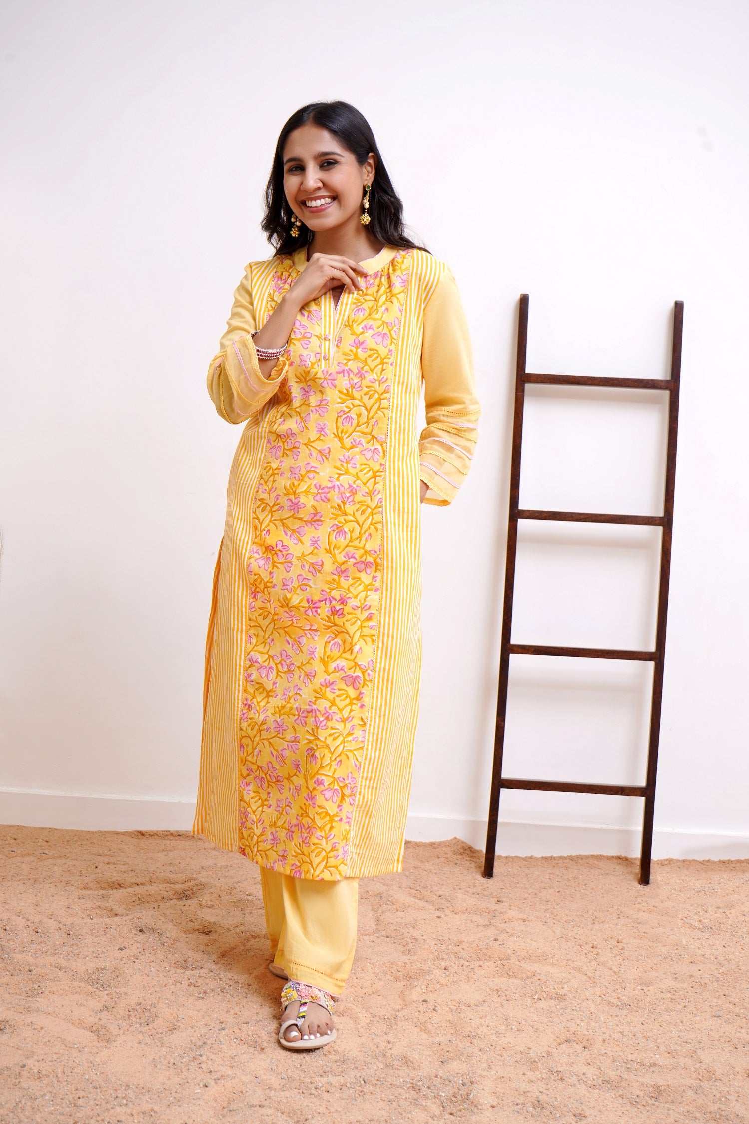 -Kurta in Sunshine Yellow and Blossom Pink Hand Block Printed Cotton Fabric with side panels and slits adding movement.