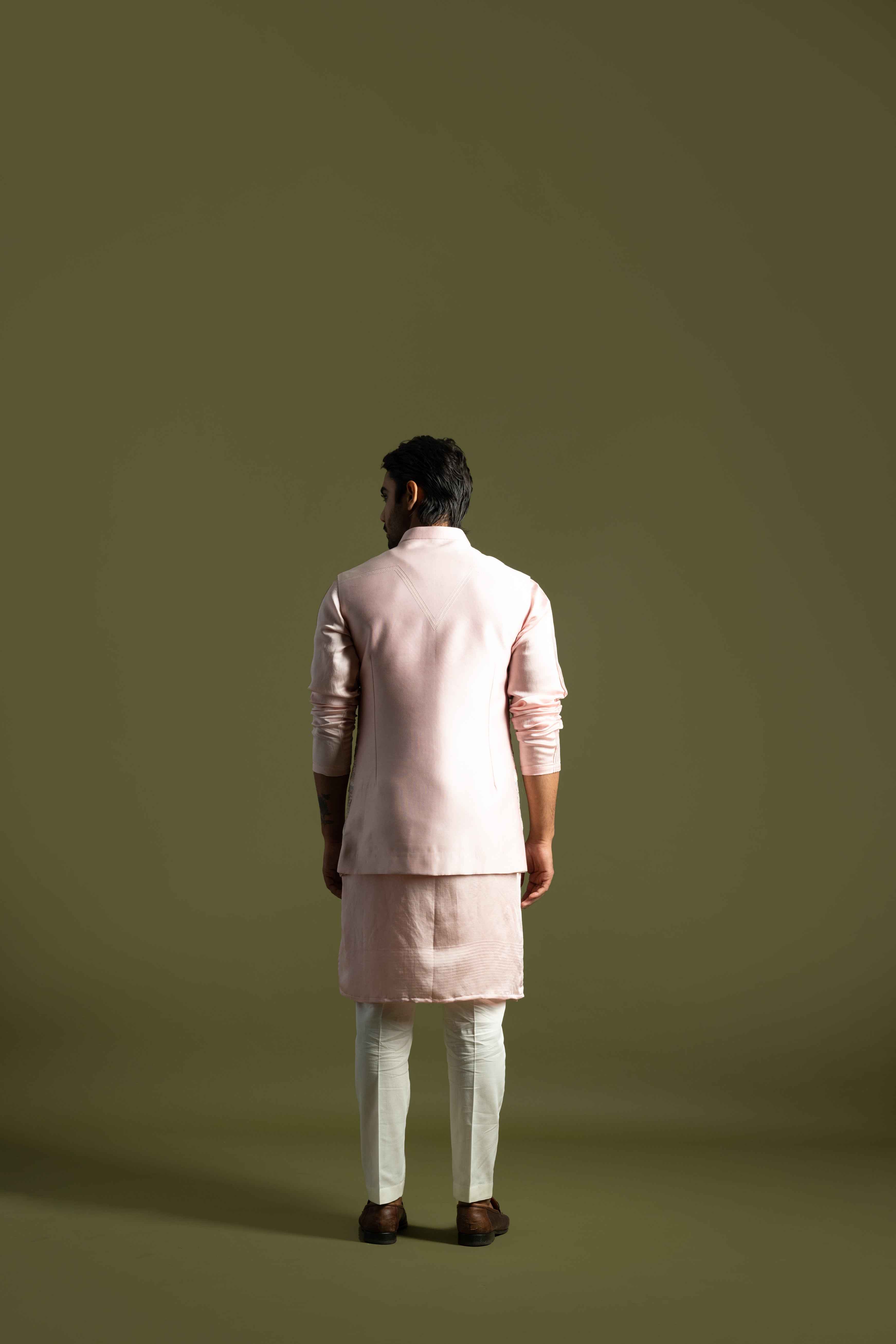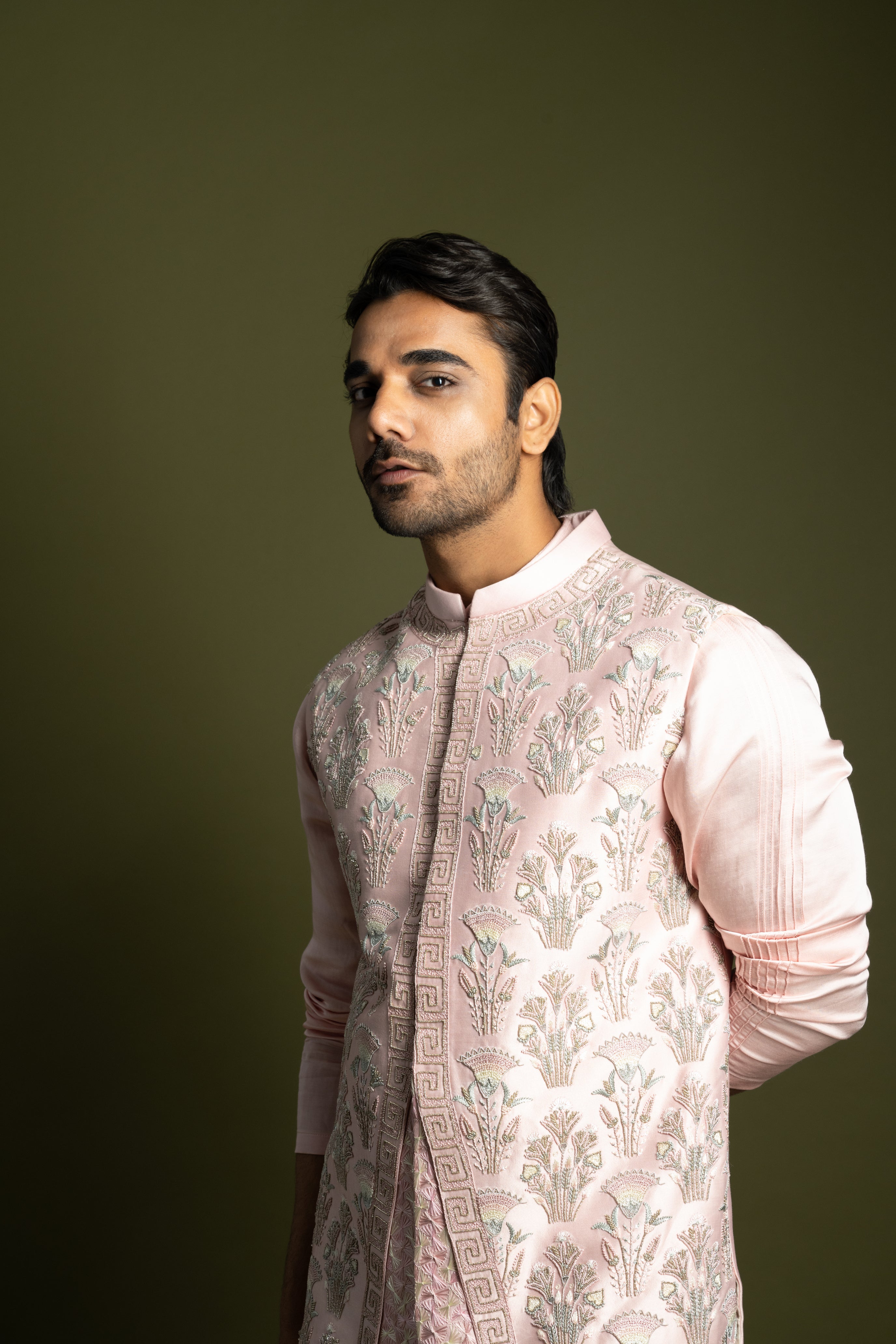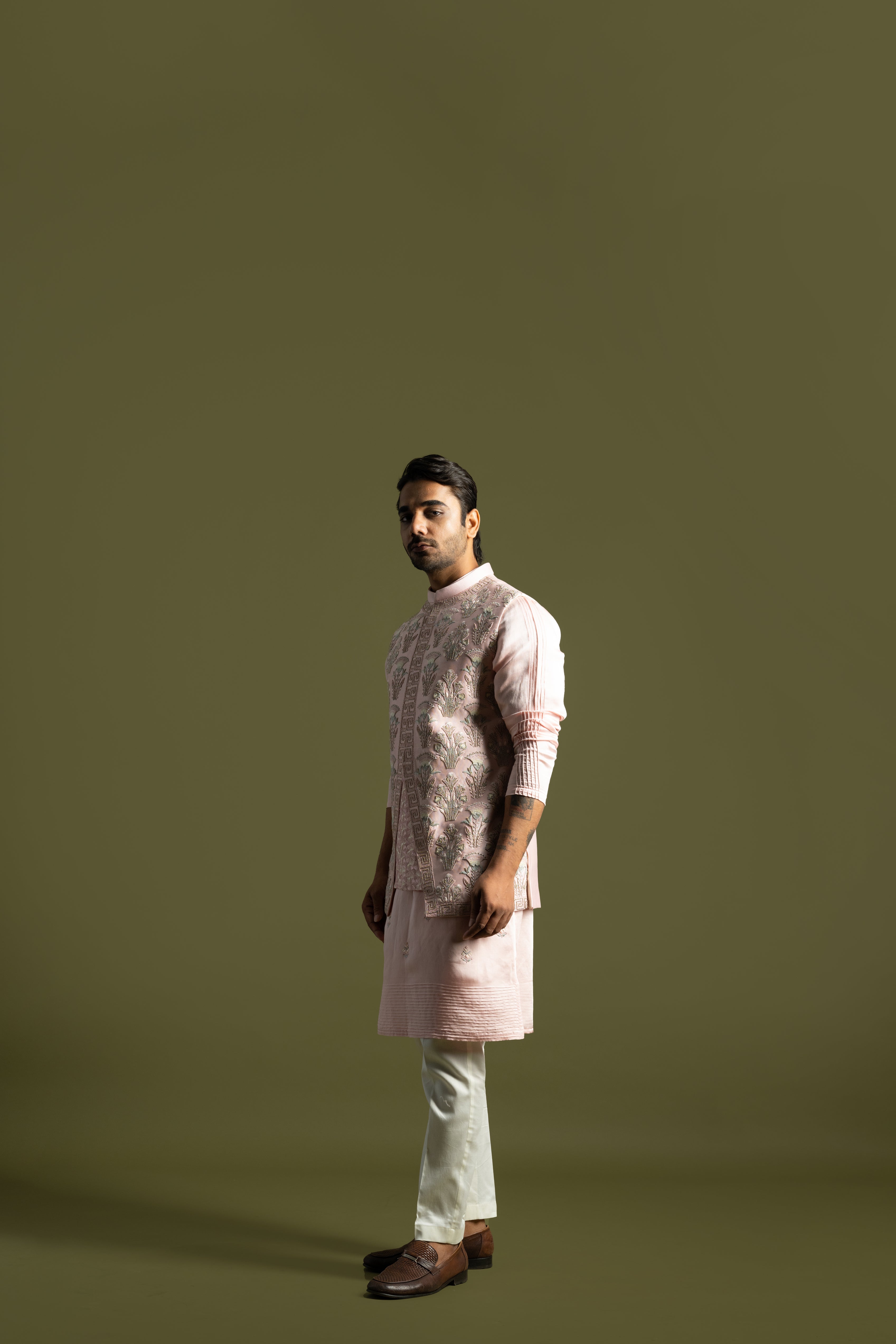| SWEET PINK NEHRU IN CHANDERI WITH HEAVY CHIRWORK AND FRENCHKNOT MOTIFS ALL OVER |