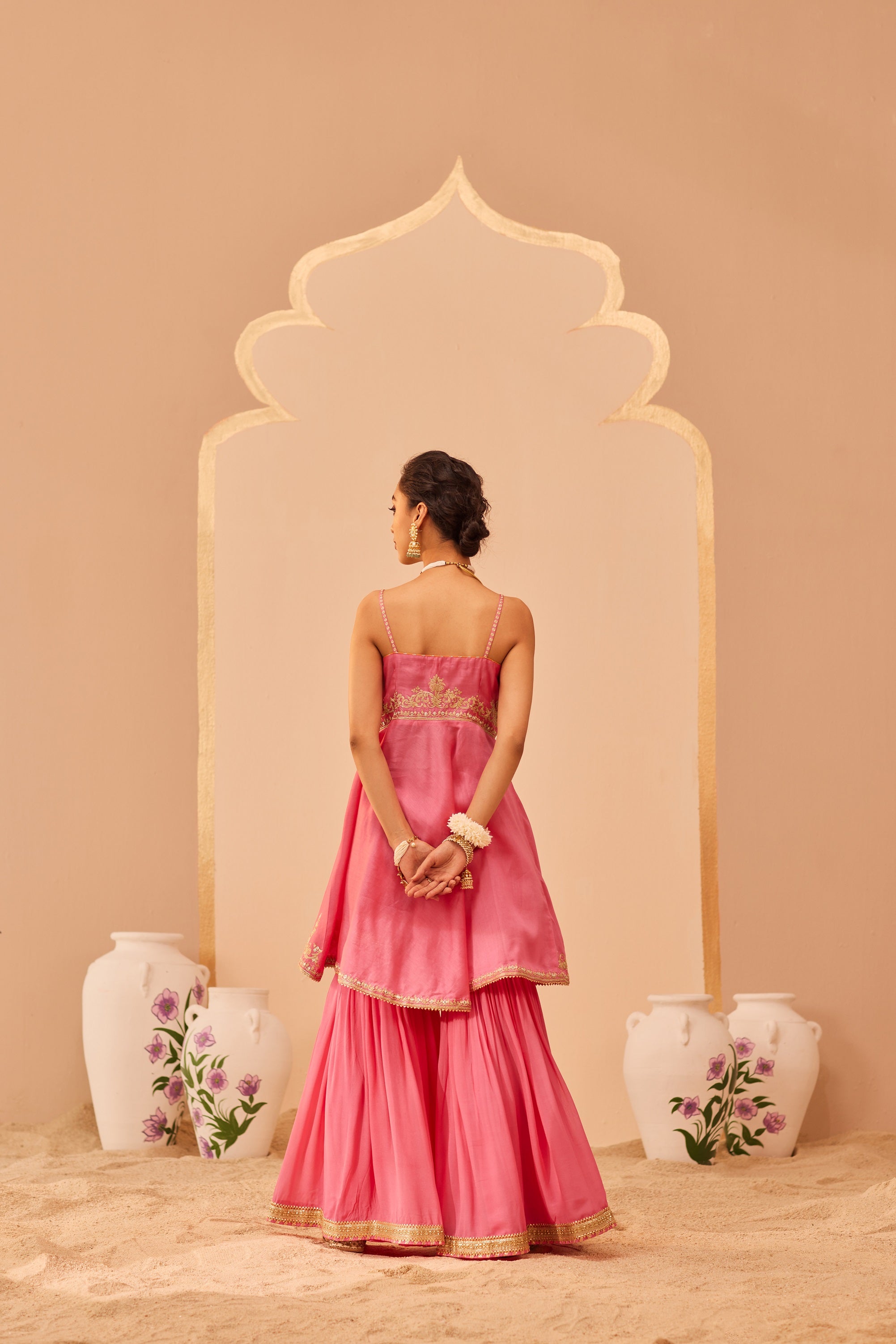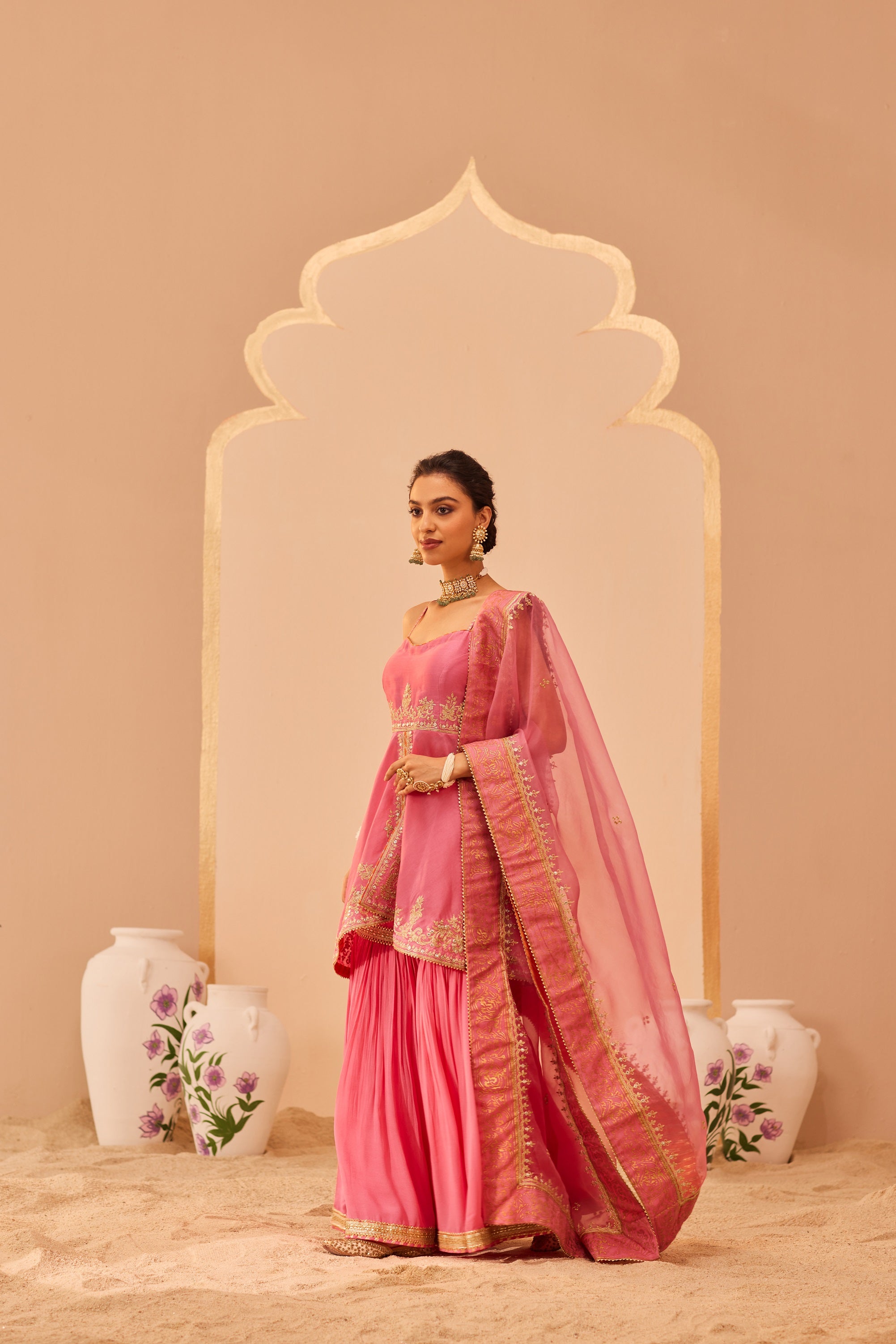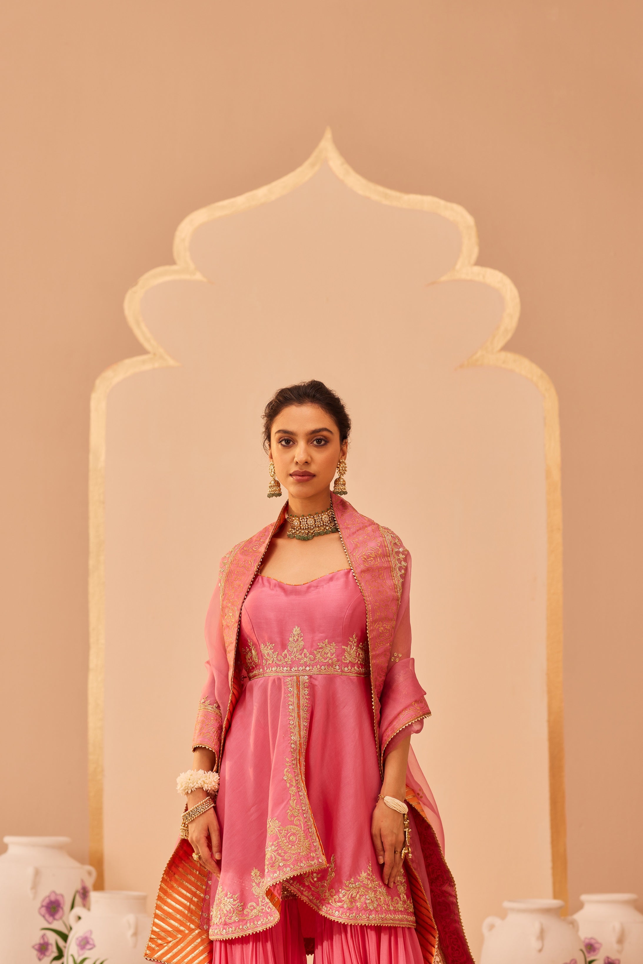 | This ensemble is made in pure silk chanderi and georgette which are teamed up with a flowy silk organza dupatta. The kurta has embroidered straps with a delicate yoke. The outfit is adorned with a signature block print which is highlighted with tilla and patra embroidery. It is finished with a pure benarsi fabric and gota detailing. |