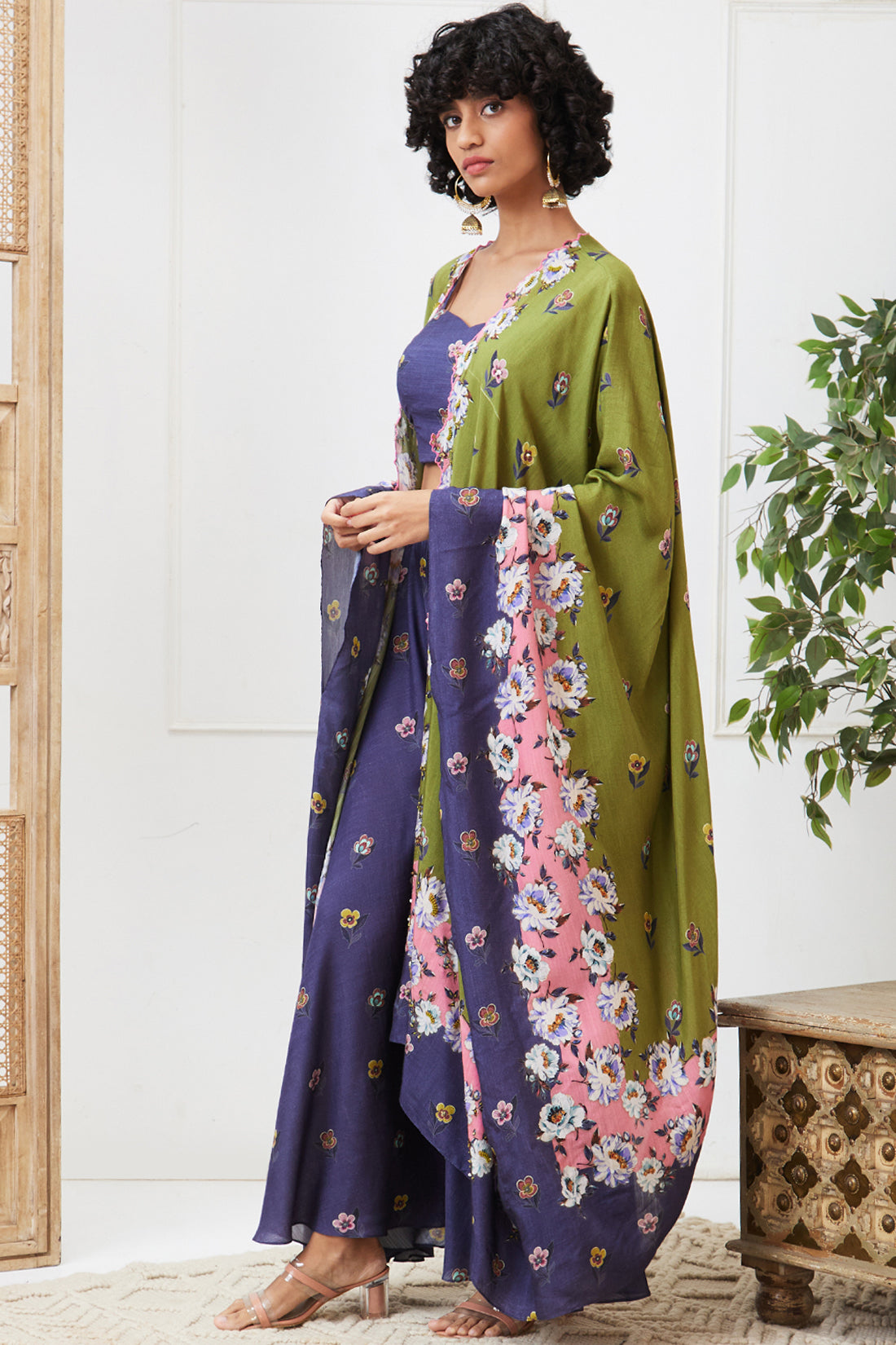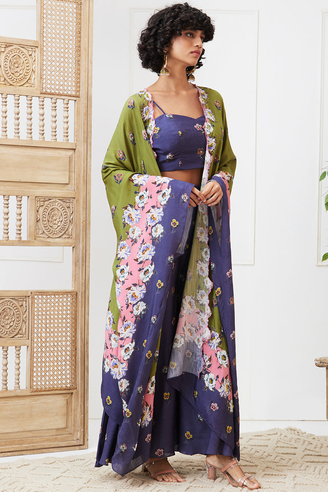 | Featuring the Blue-green Tasnim printed co-ord set with the kimono jacket .it is paired with crop top,jacket and palazzo |