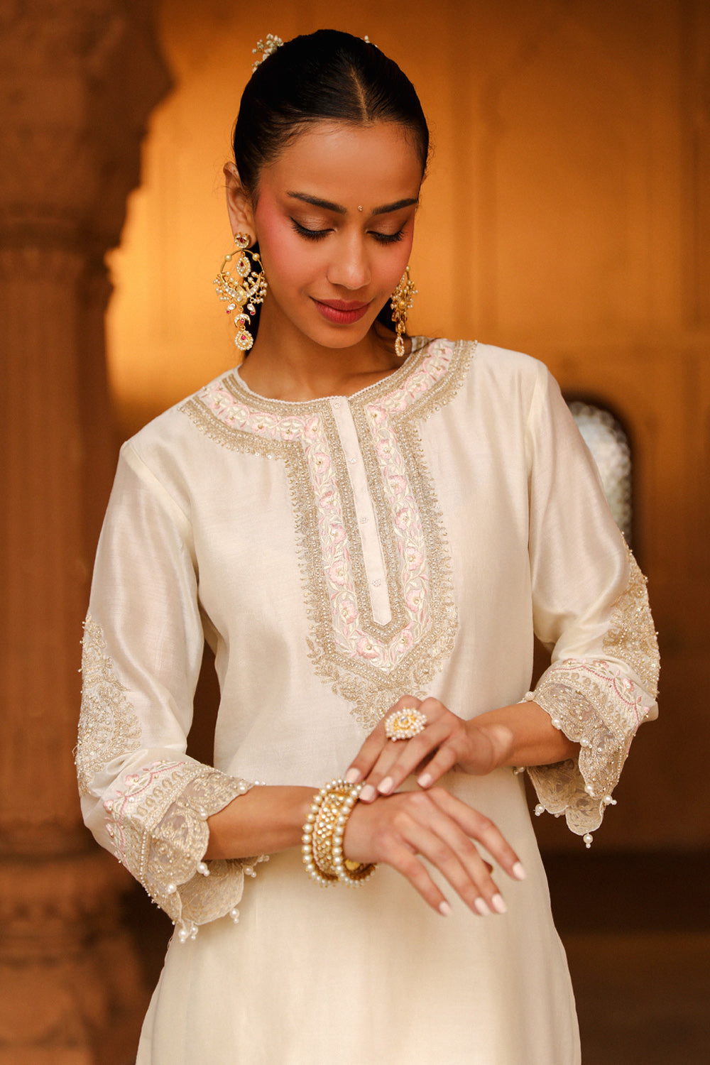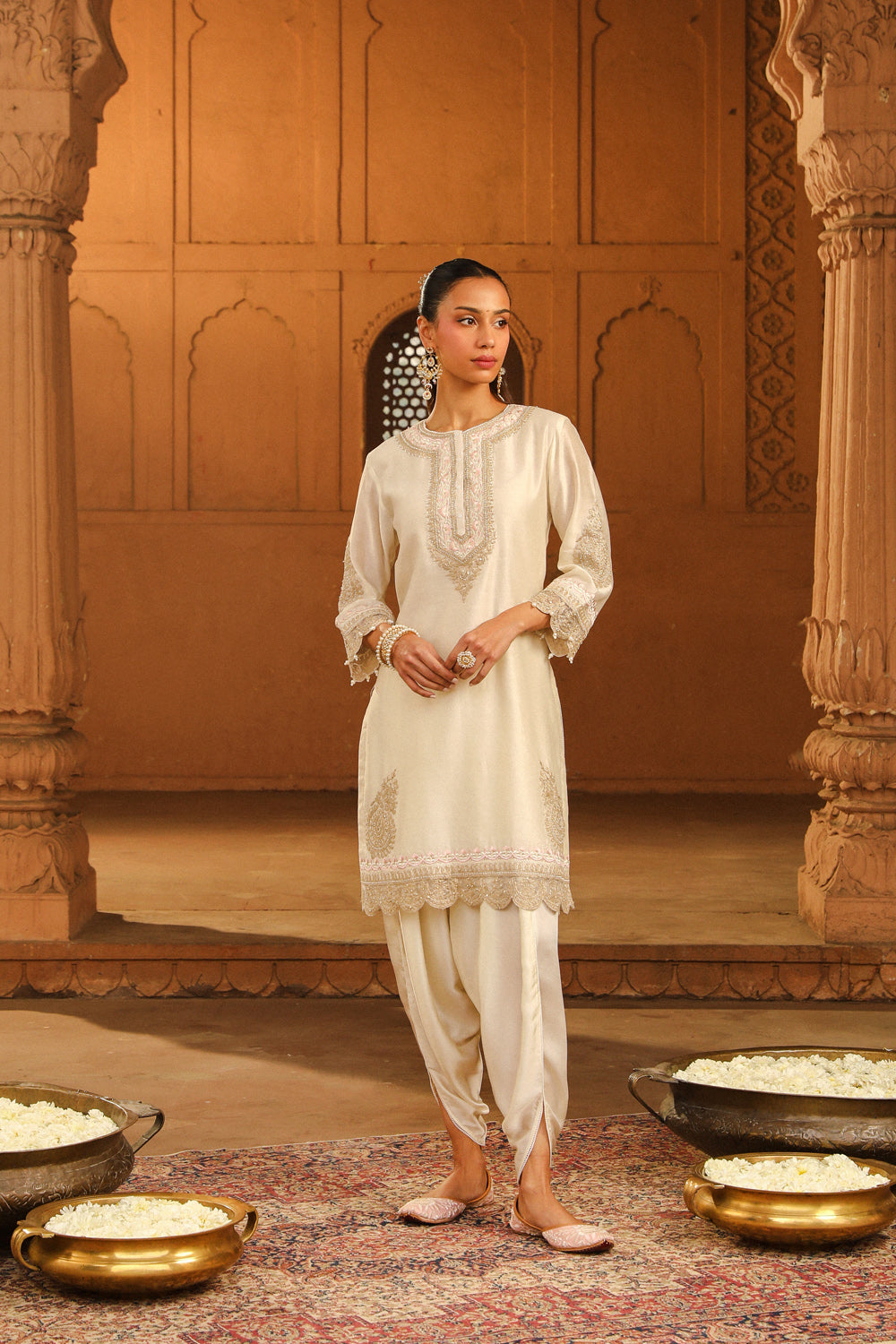 The Anika short kurta with salwar from our Mehnoor Collection is made in silk chanderi with a dhoti. The kurta is having a zero neck with slit and three-quarter bell sleeves. The kurta is adorned with Kashmiri tilla and parsi gara embroidery highlighted with basra moti. The sleeves of the kurta is a having an organza detailing. The outfit is finished with scallop detailing.