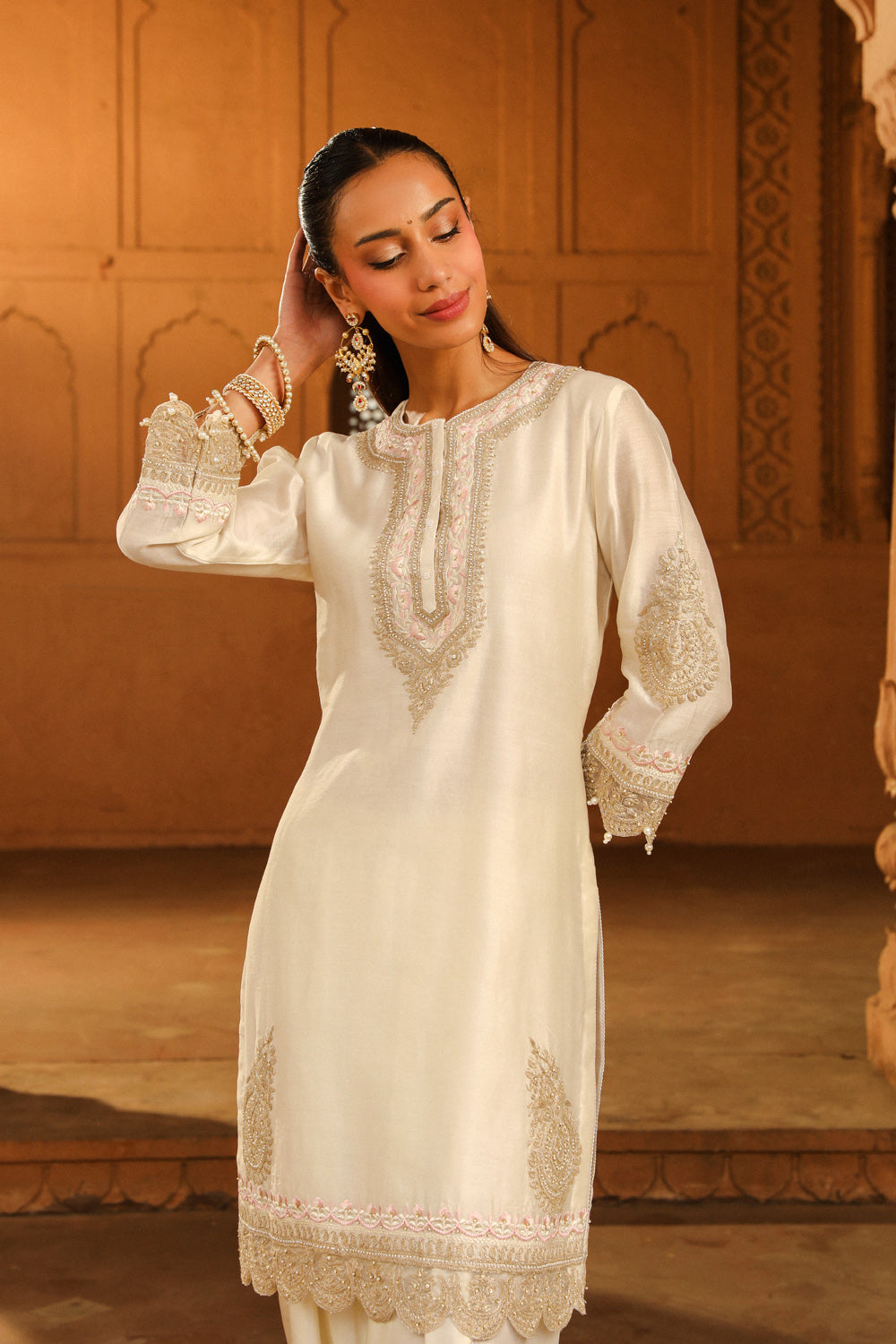 Choose a short kurta with intricate embroidery, embellishments, or prints that complement the elegance of the ivory color. Consider traditional Indian motifs or modern geometric patterns for added visual interest