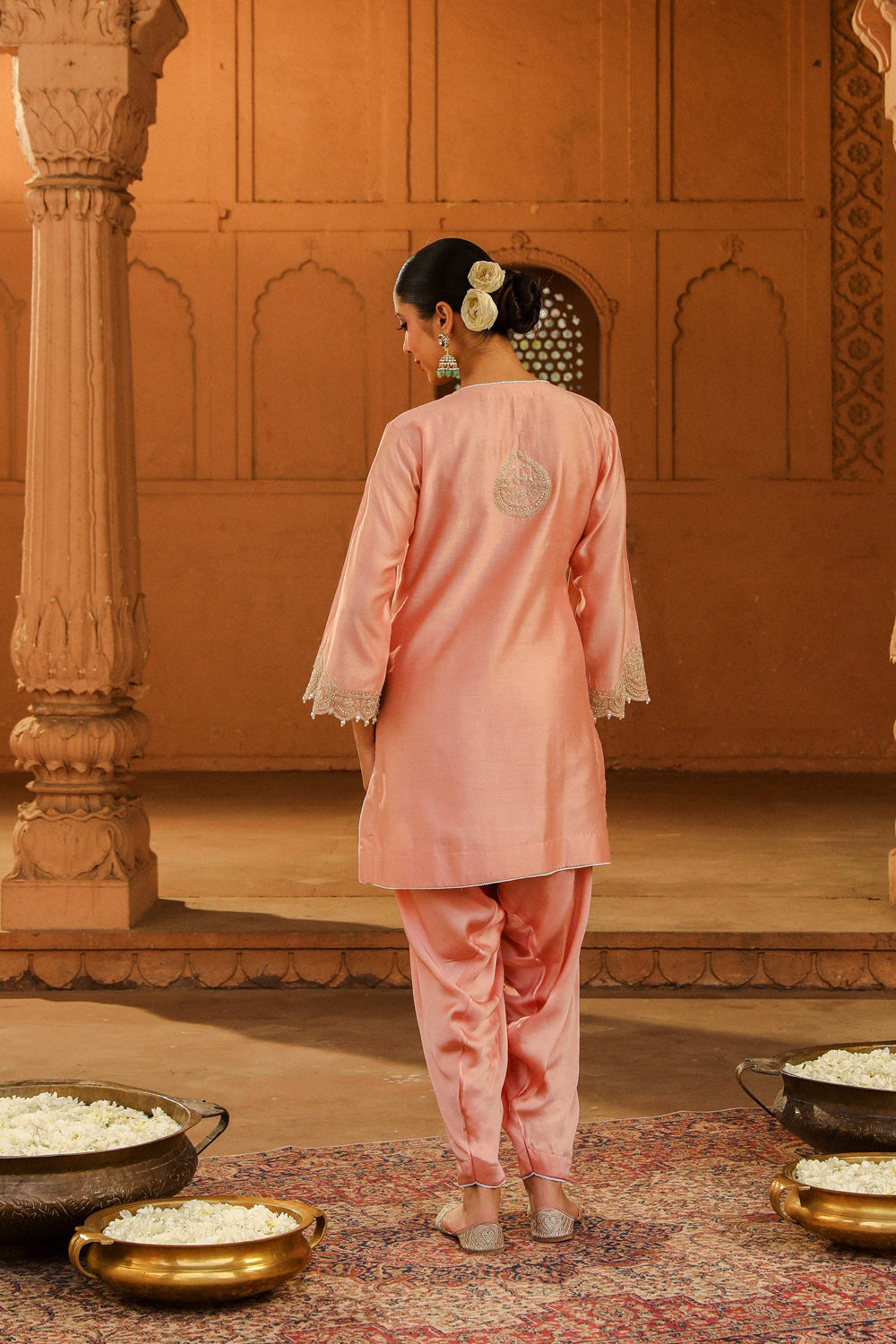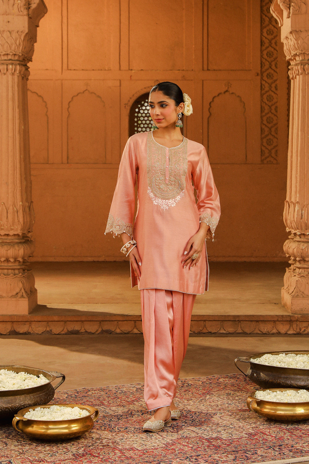 The Arisa short kurta with salwar from our Mehnoor Collection is made in silk chanderi with a dogri salwar. The kurta is having a zero neck with placket and three-quarter bell sleeves. The kurta is adorned with Kashmiri tilla and parsi gara embroidery highlighted with basra moti. The sleeves of the kurta is a having an organza detailing. The outfit is finished with scallop detailing.