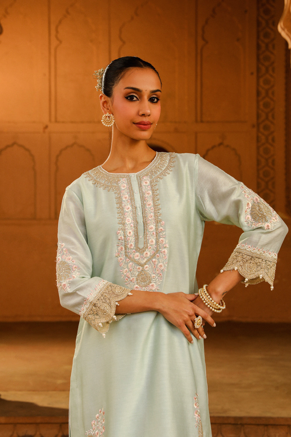 The Ernika short kurta with salwar from our Mehnoor Collection is made in silk chanderi with a dhoti. The kurta is having a zero neck with slit and three-quarter sleeves. The kurta is adorned with Kashmiri tilla and parsi gara embroidery highlighted with basra moti. The sleeves of the kurta is a having an organza detailing. The outfit is finished with scallop detailing.