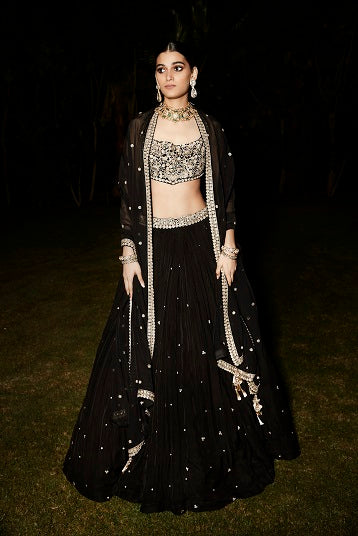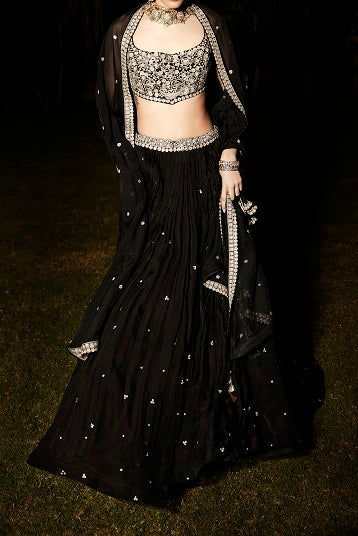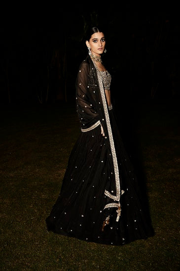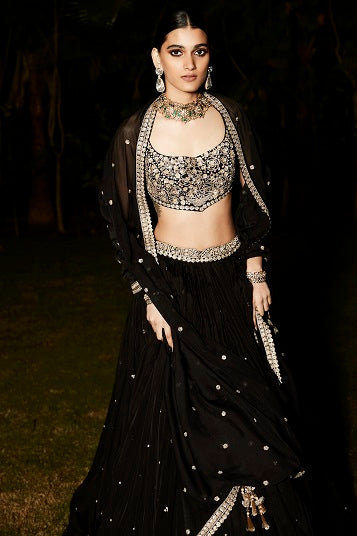 | The NEW Look An evolution of Matsya. Tarnished Silver Embroidery in Vintage Zardozi. Aztec & Flora inspired artworks. The Old & The New, in just an all new Matsya look. Created in Plant based organza georgette with a flowy lehenga with a starry sky in Noir carrying the Matsya belt. The blouse is in a signature Matsya Roman flow-down shape. The dupatta is embroidered on all 4 sides and gracefully tasseled. |
