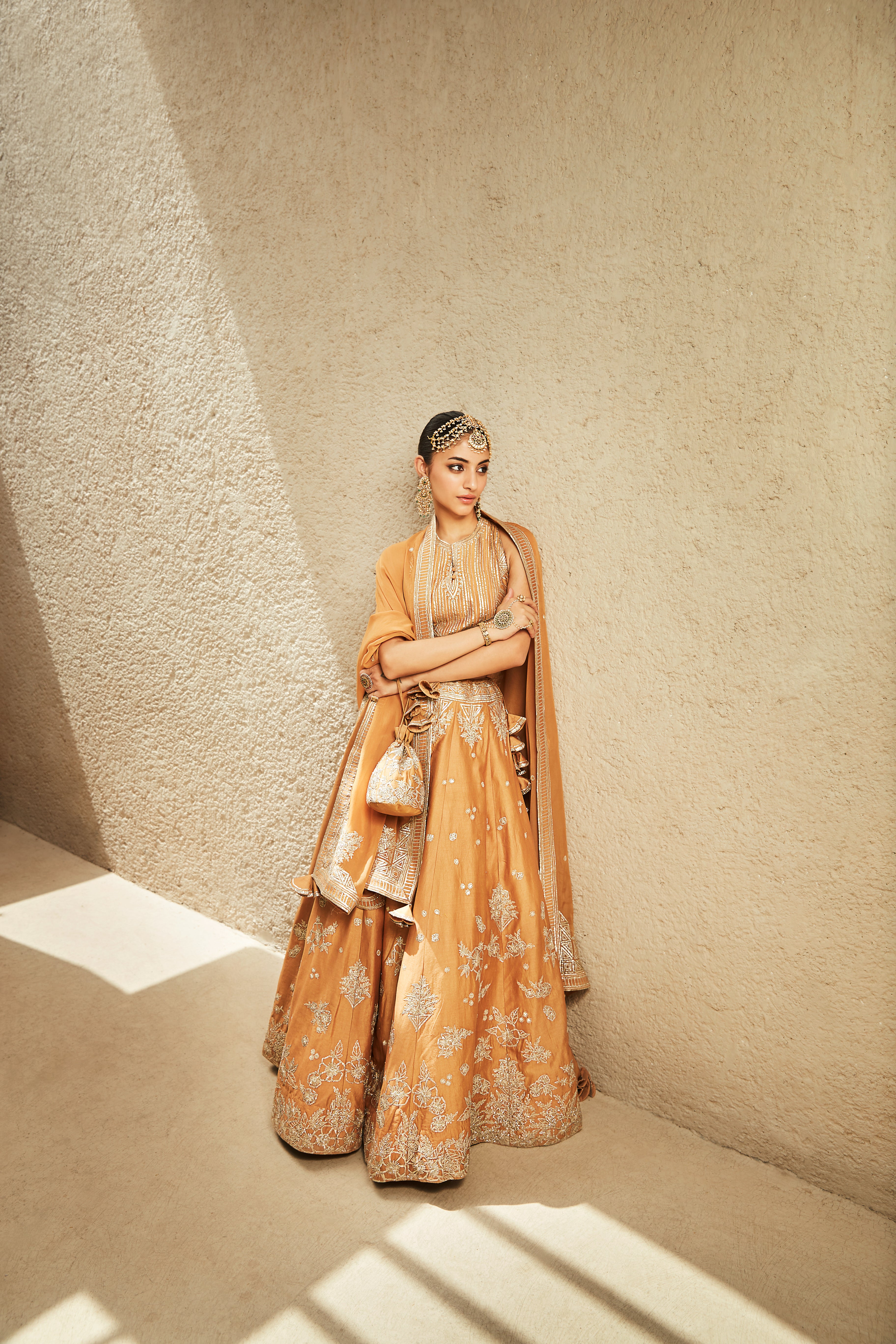 Fiercely feminine and ultra-modern, this mustard lehenga boasts Matsya's signature tarnished silver gota patti & zari work and is inspired by everything art deco and India. The lehenga and the halter-neck blouse are both crafted in chanderi, while the tasseled dupatta is made from luxe organza. Taking it up a notch is the matching embroidered potli, completing the look on the right note.