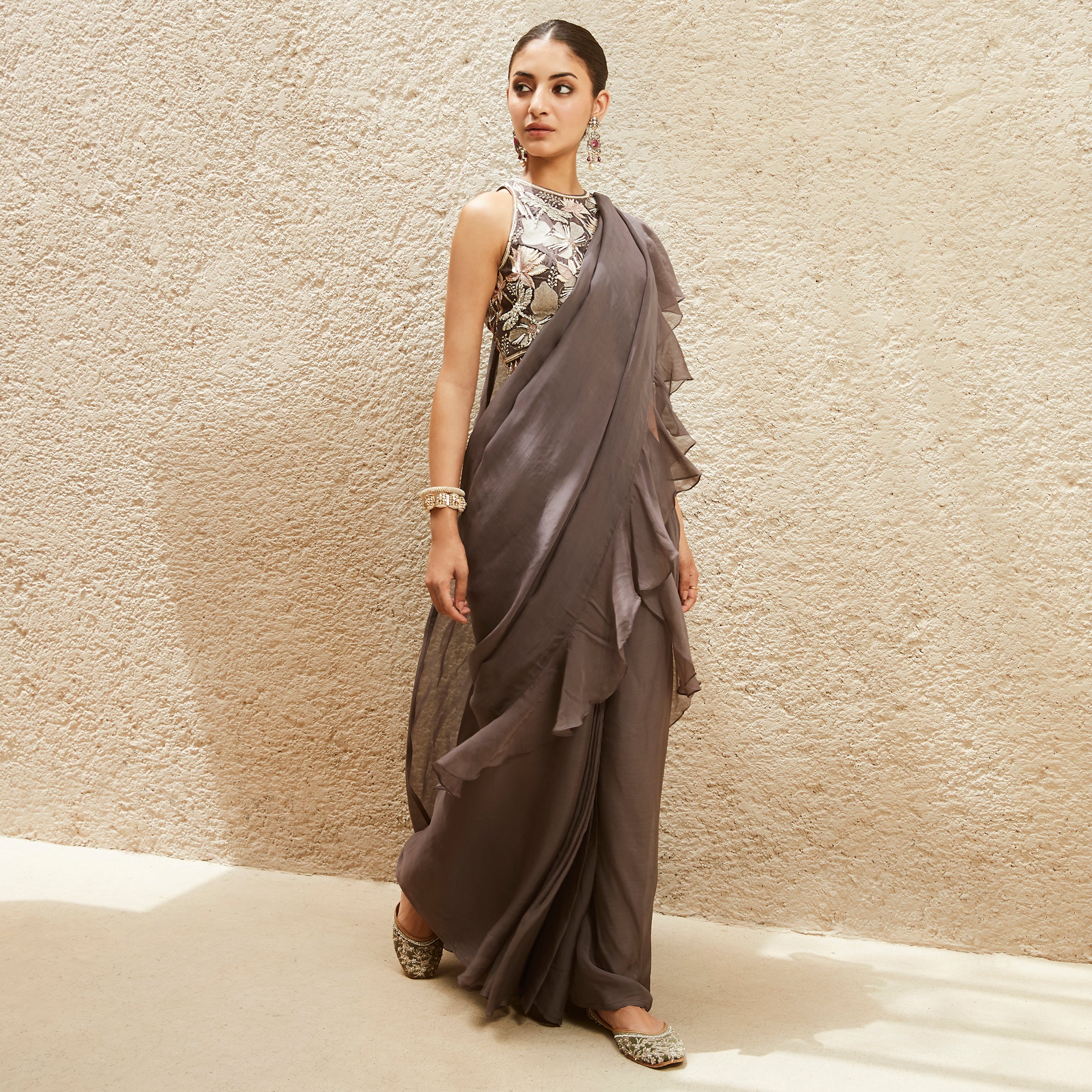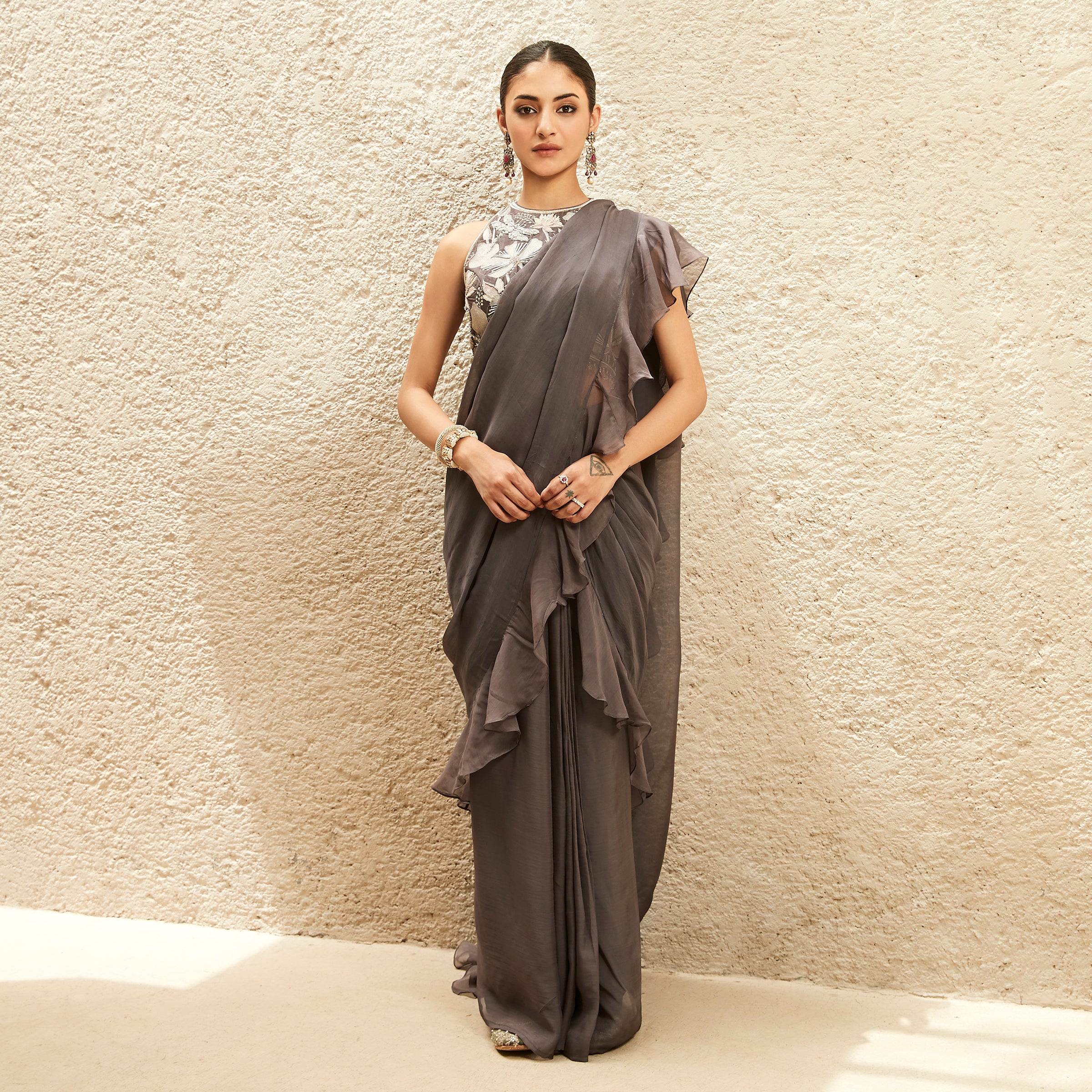 Playful ruffles take centre stage in this draped saree in an alluring grey palette and luxe organza base for Matsya's Heritage Pret '23 line. The halter-neck blouse features exceptional resham threadwork with pearls, sequins and beads hand-done by expert craftsmen, making it a true investment piece.