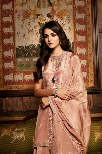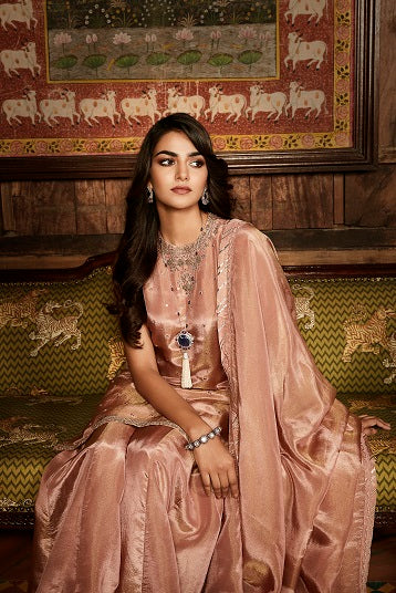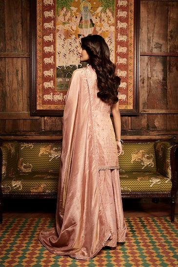 | The Paaro Sharara is handcrafted in georgette tissue with delicately blended patra mirrors and antique beaded zardozi. The sharara & dupatta feature a fine geometric gota detailing to add to layer of vintage glamour. The tissue is dyed in an old rose colour fading into earthy pastels. |