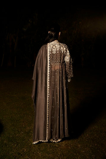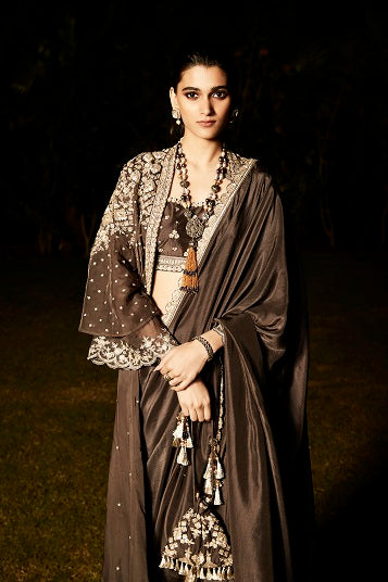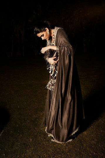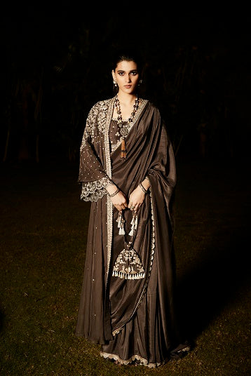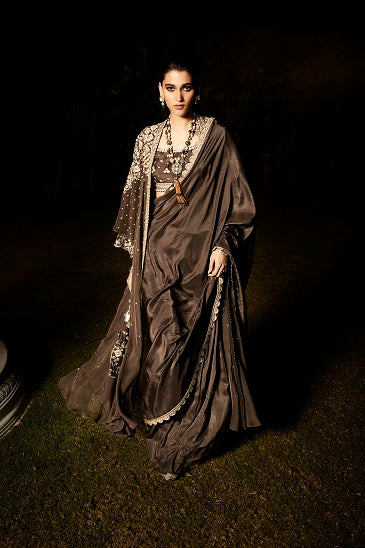 | The NEW Look An evolution of Matsya. Tarnished Silver Embroidery in Vintage Zardozi. Aztec & Flora inspired artworks. The Old & The New, in just an all new Matsya look. Handcrafted in Silk, the charcoal saree comes with a scalloped border. The royal jacket takes inspiration from parisian architecture & the starry glamour falling down. The colour, itself is inspired from the city of Paris. |