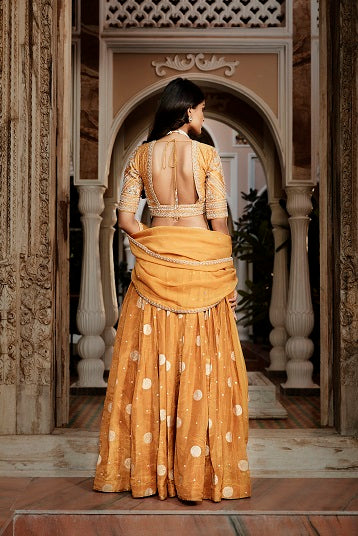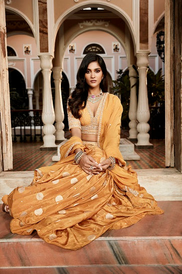| The Kashi lehenga for the 22-23 season is crafted on tissue banarasi with a silk chanderi blouse. Hand dyed in our signature Vintage Haldi colour adorned with Matsya's signature kachi dori & zardozi. The dupatta is in a georgette organza, light weight & flowy with detailed corners in couture embroidery. |