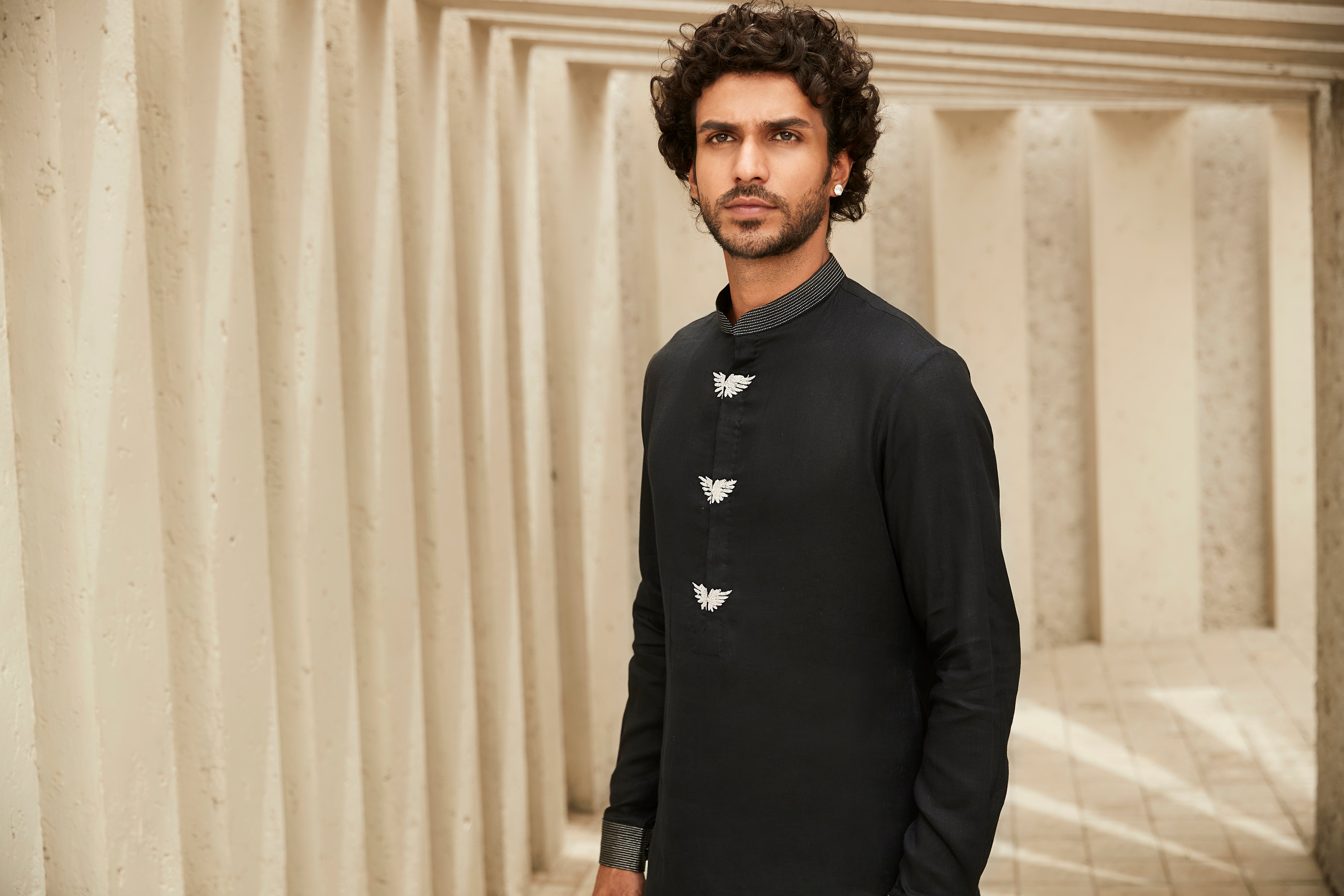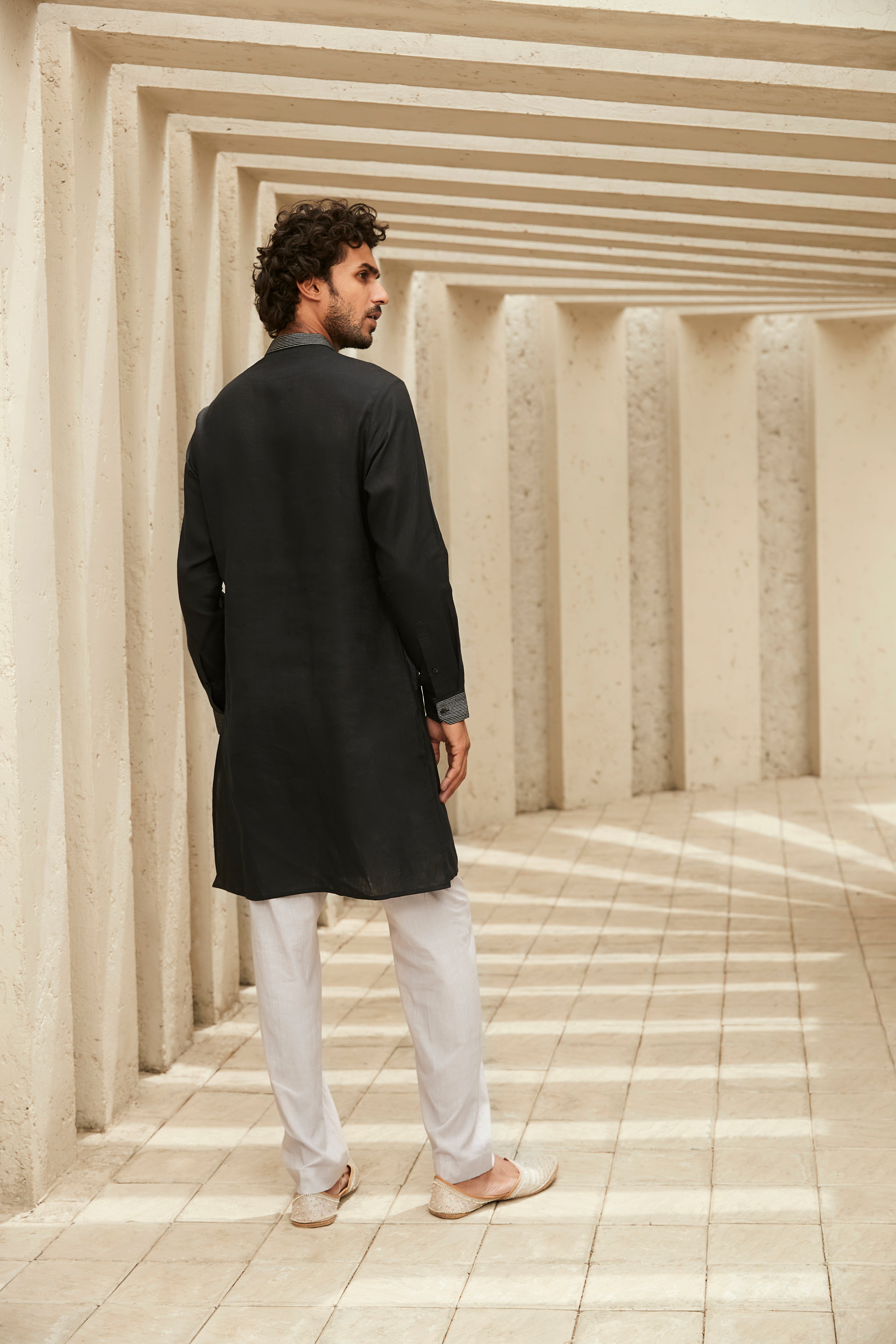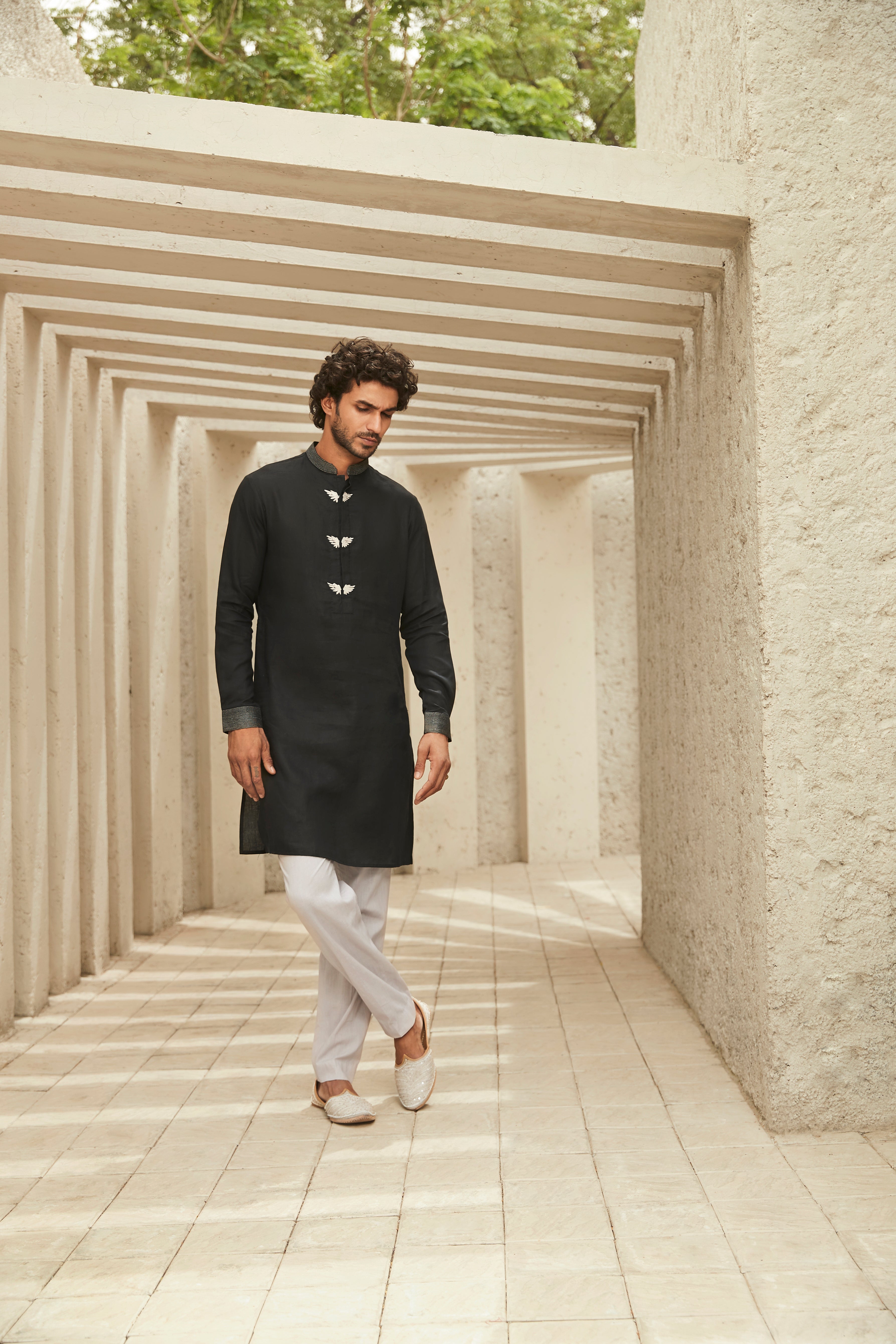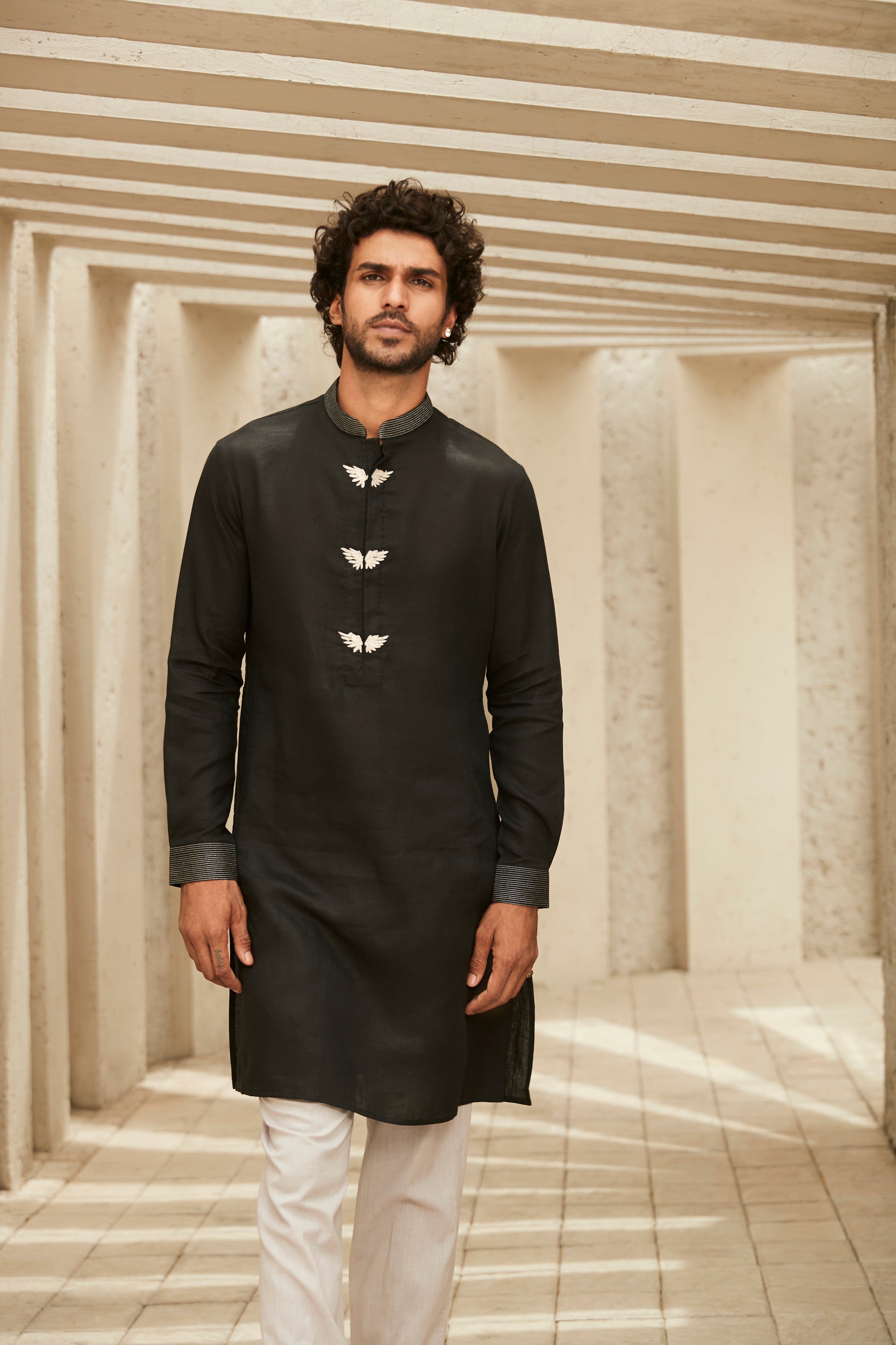 Exude understated sophistication in this black & white kurta set from Heritage Pret '23 crafted in luxe linen. The neckline boasts embroidered wing motifs with dori work and the cuffs are adorned with silver zari thread.