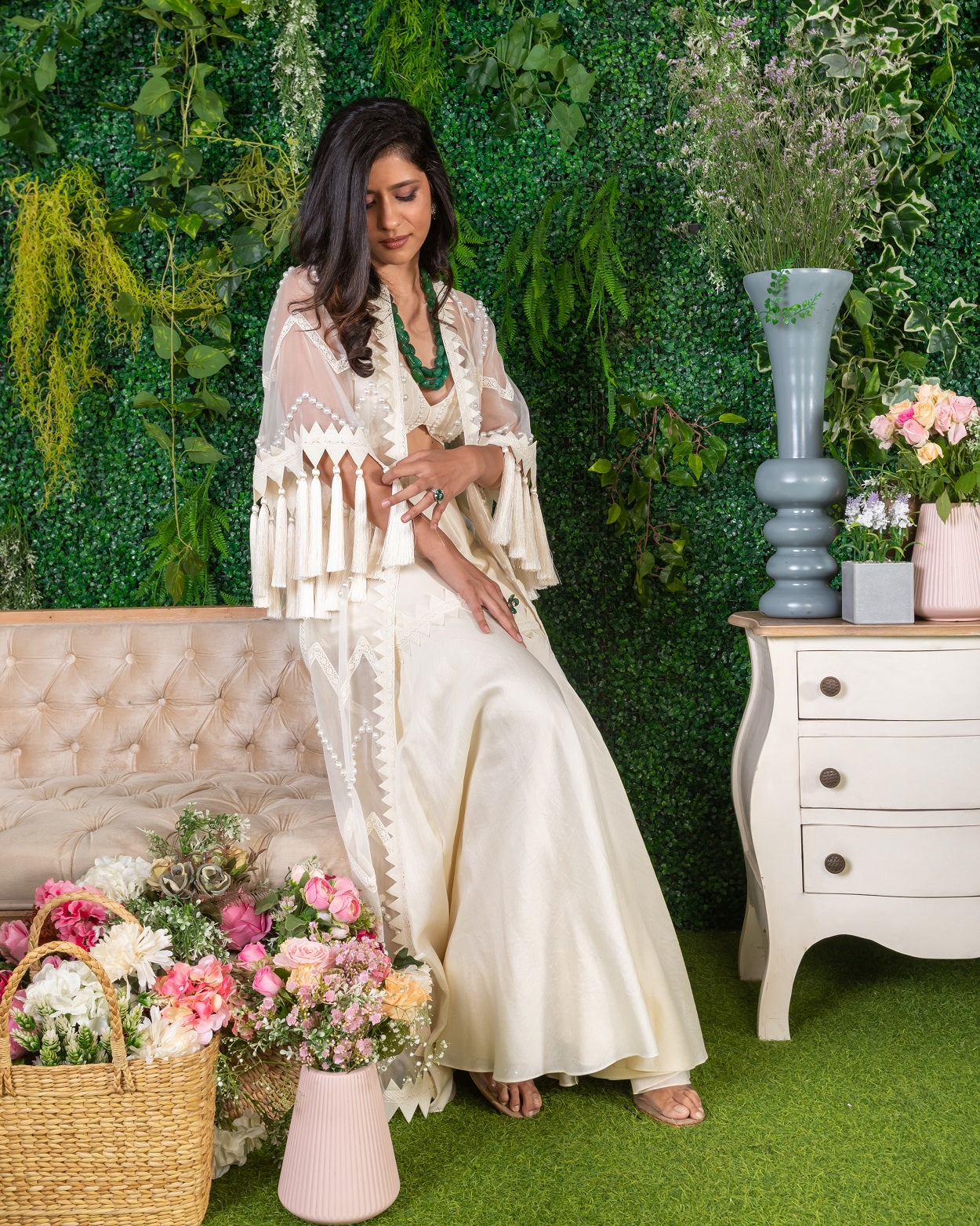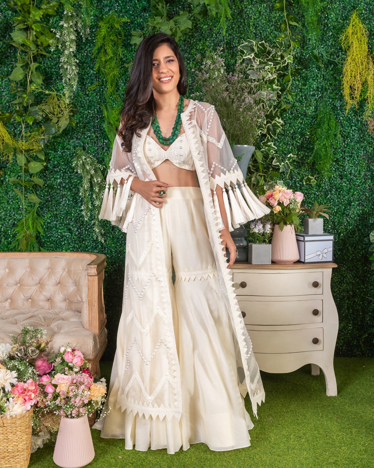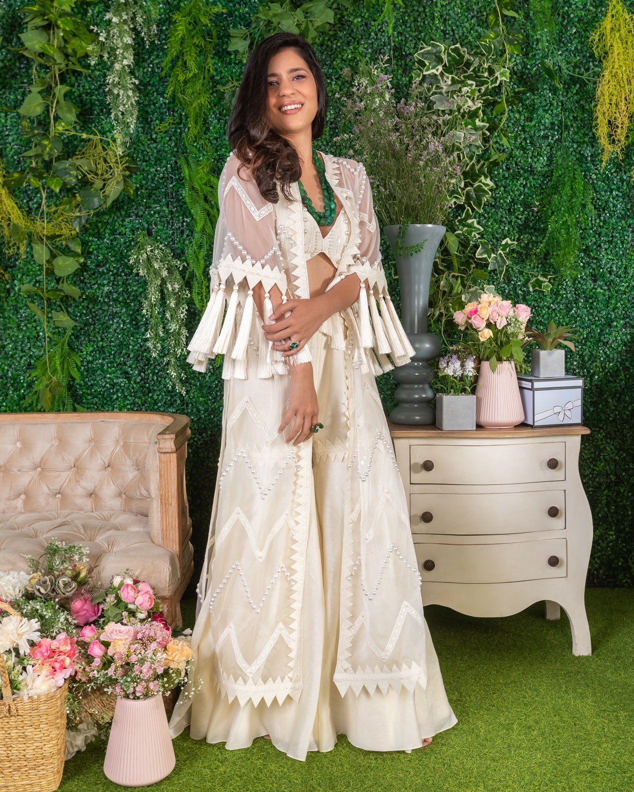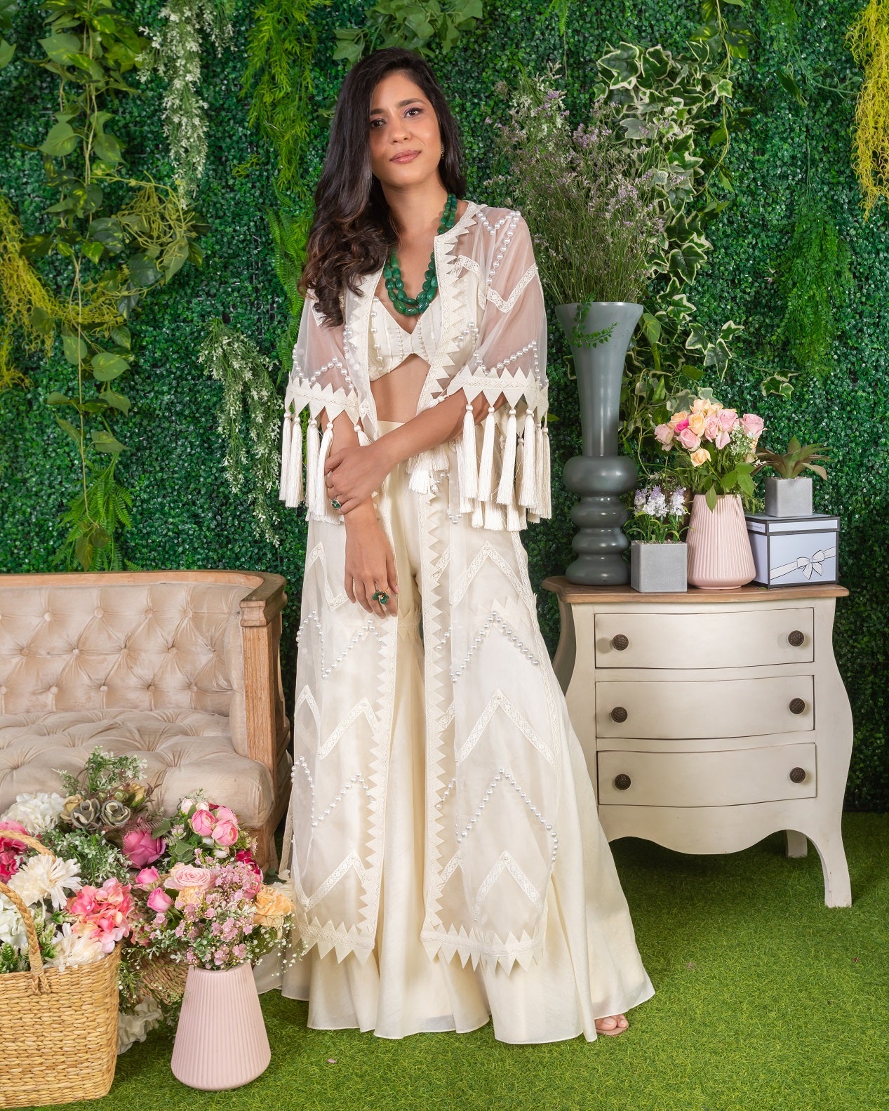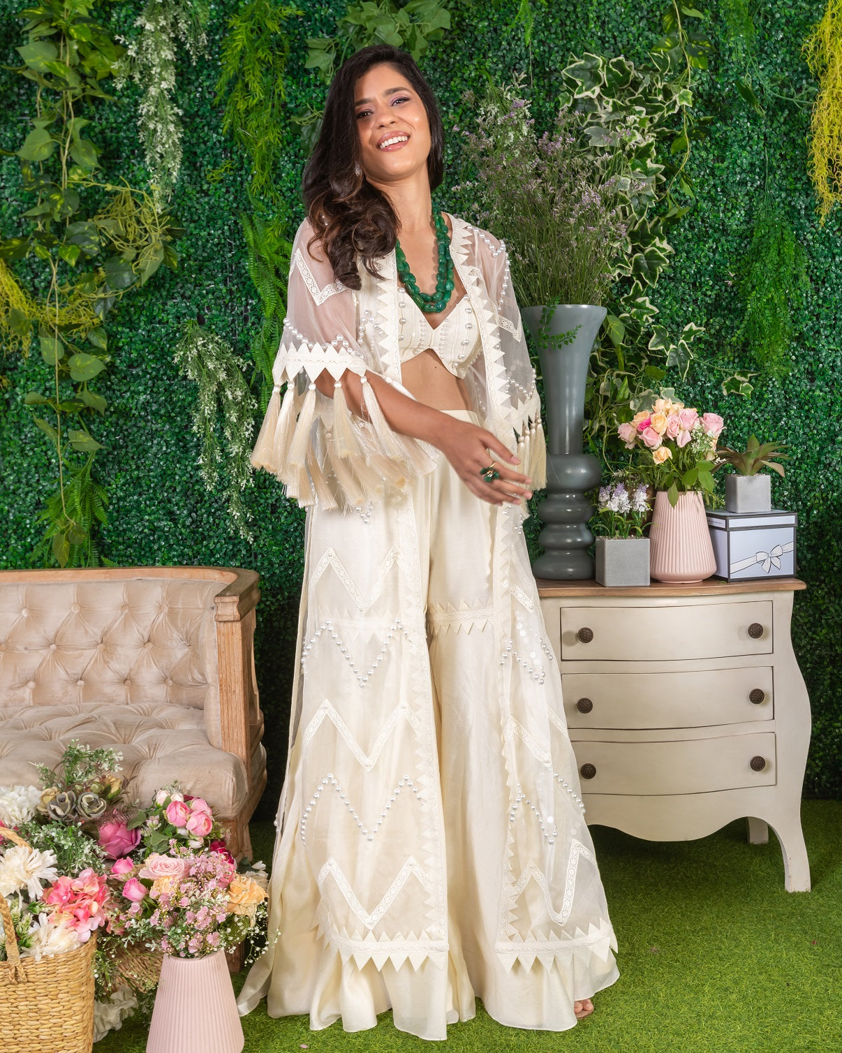 Featuring a vanilla jacket in chanderi and organza base with lace, fringe, samoosa patti and pearl hand work. It is paired with a matching bustier and gharara pants