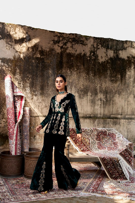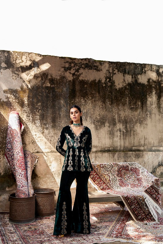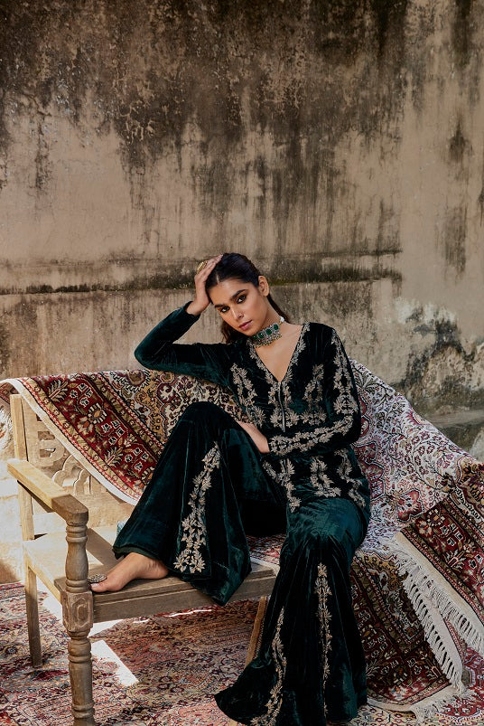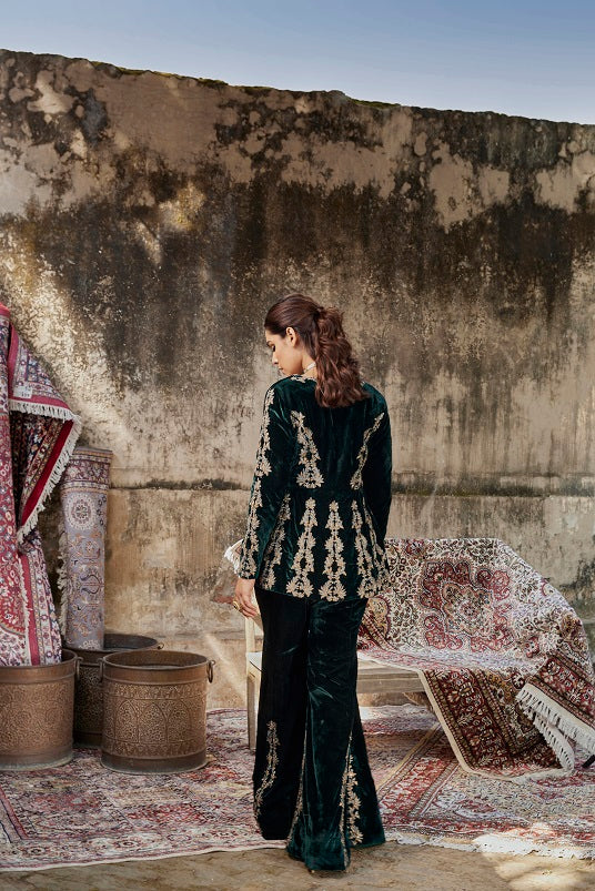 Featuring the Bottle Green colour Pure velvet jacket with flared Pants.its is paired of 2 in set.