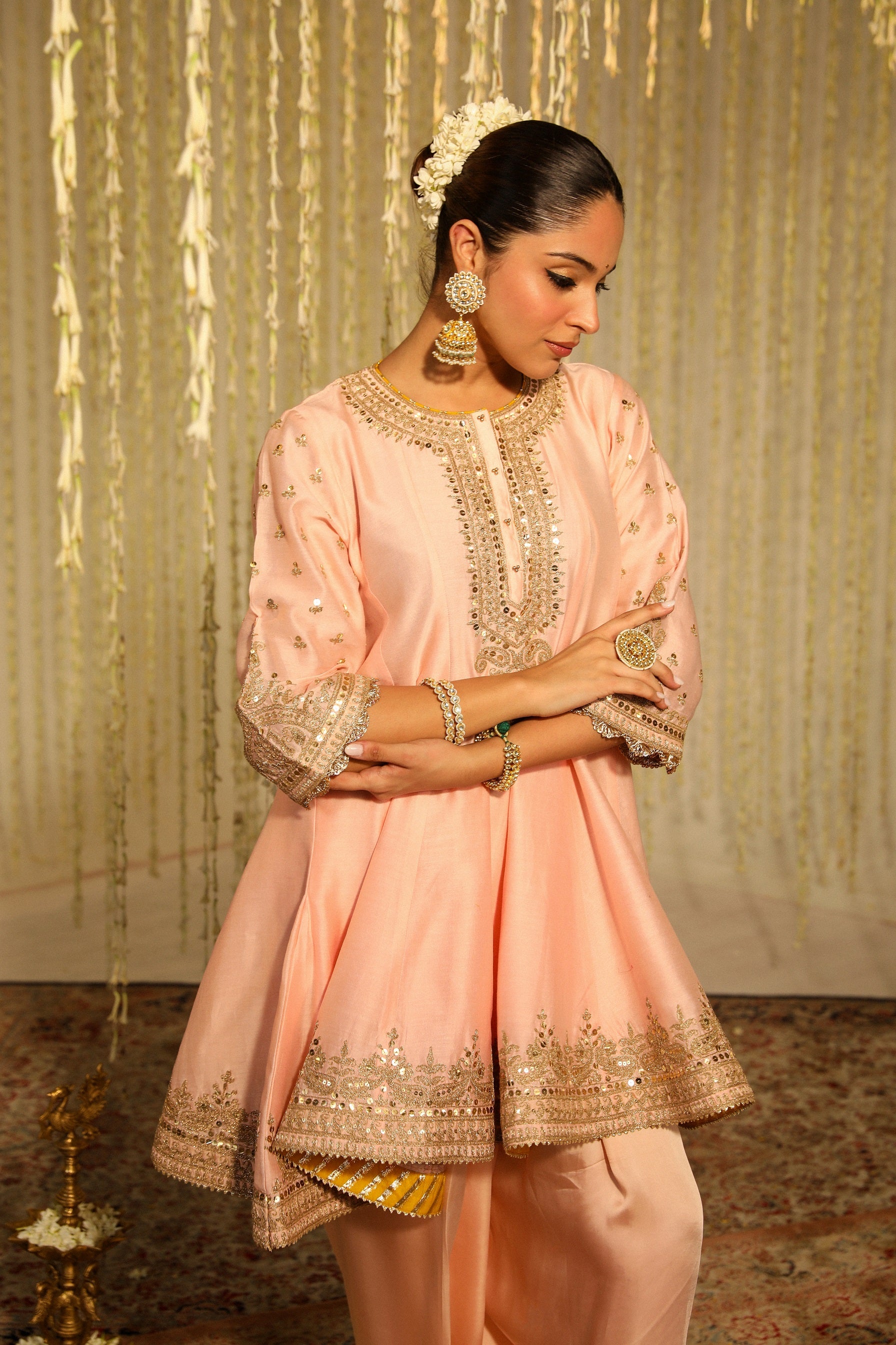 | The short kalidaar Warizah ensemble is made in pure silk chanderi fabric teamed up with a dogri salwar and a silk organza dupatta. The outfit is having a zero neck with placket and three-quarter bell sleeves. The outfit is adorned with exquisite kirandori with sitaara. The outfit is finished with a contrast banarsi and kinari. |