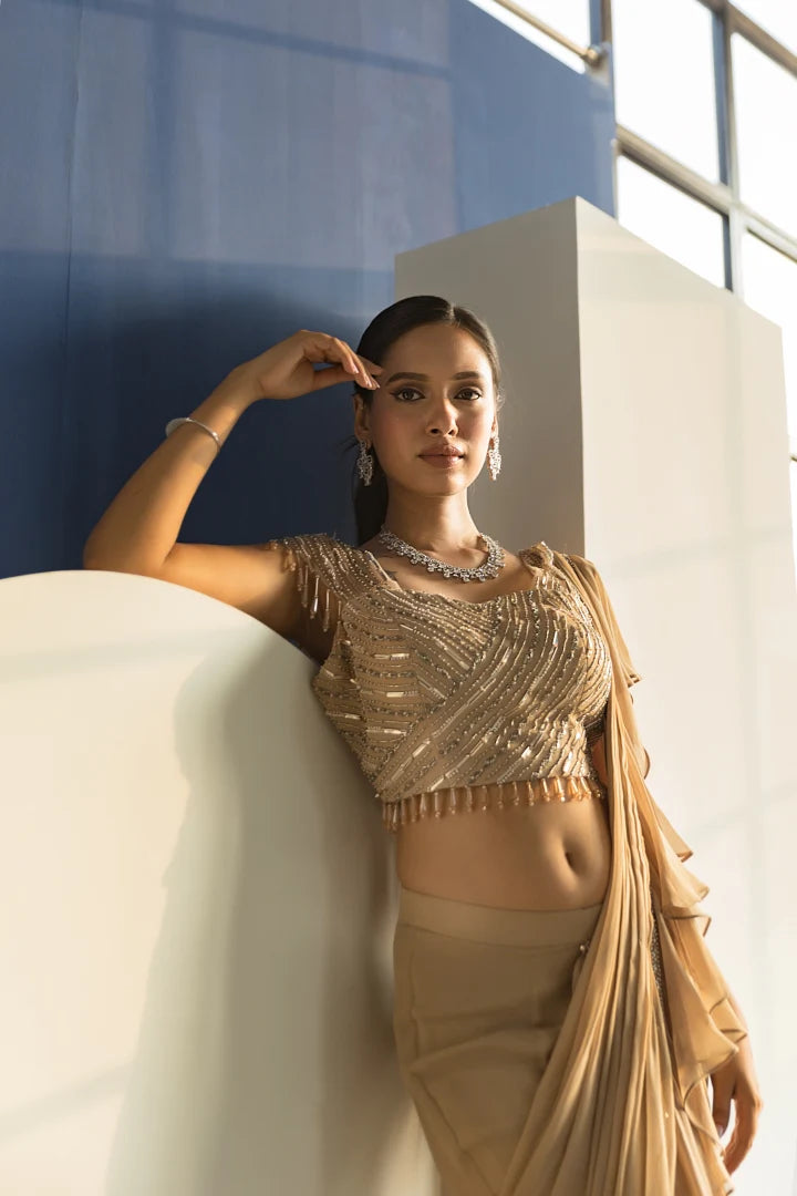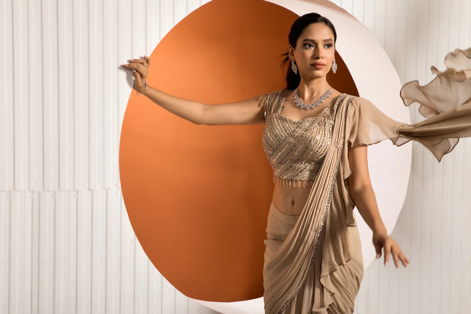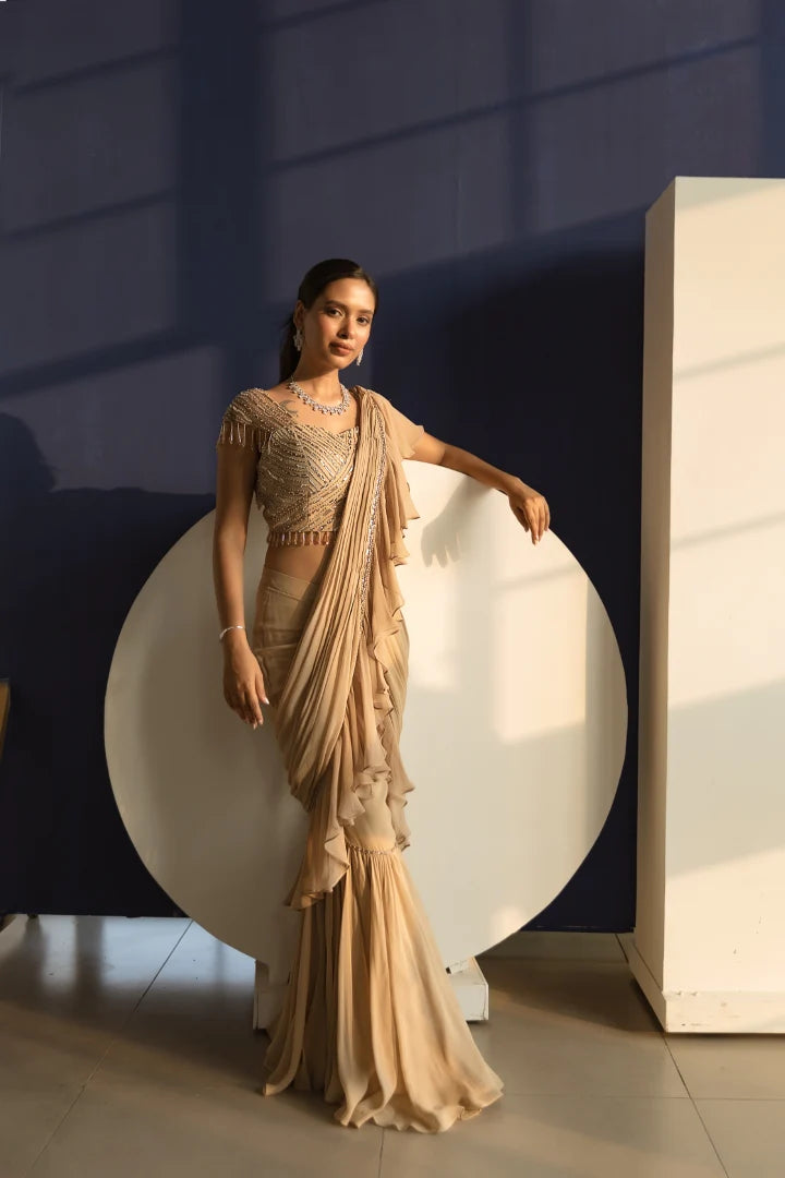 | A cheerfully voguish silhouette, hand crafted in the luxurious comfort of georgette is this Garara draped saree. The trendy tan color and lovely accents make this saree a must-have in your wardrobe. |