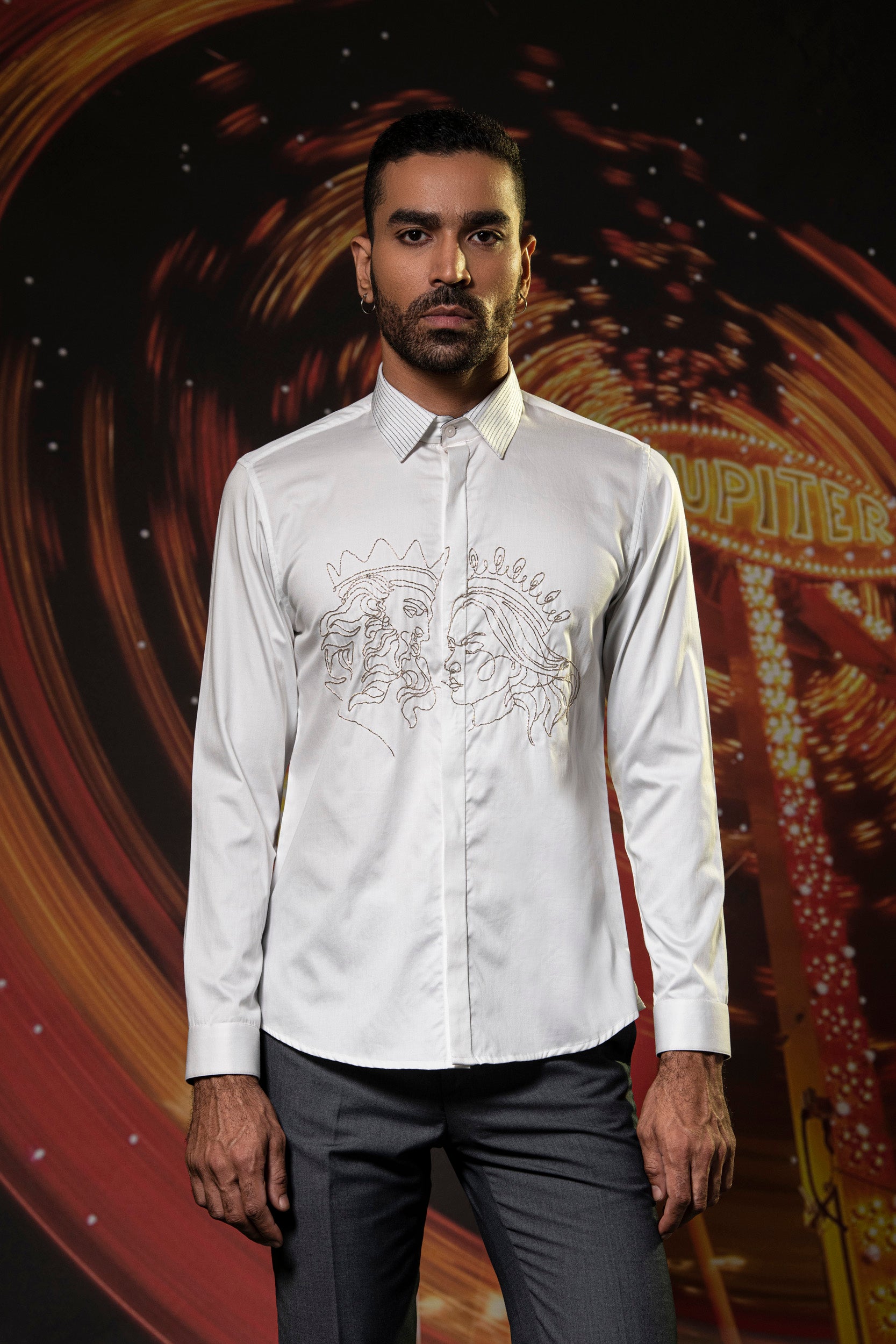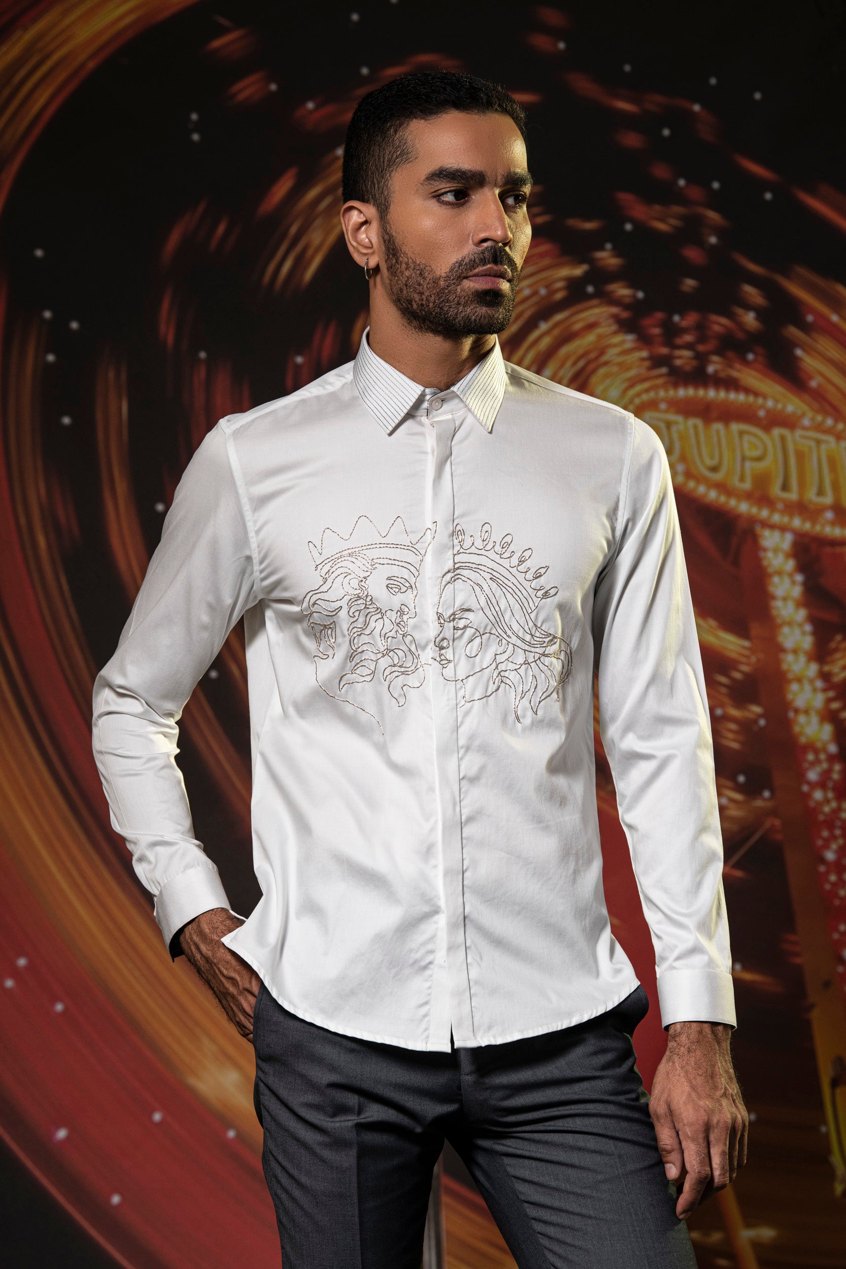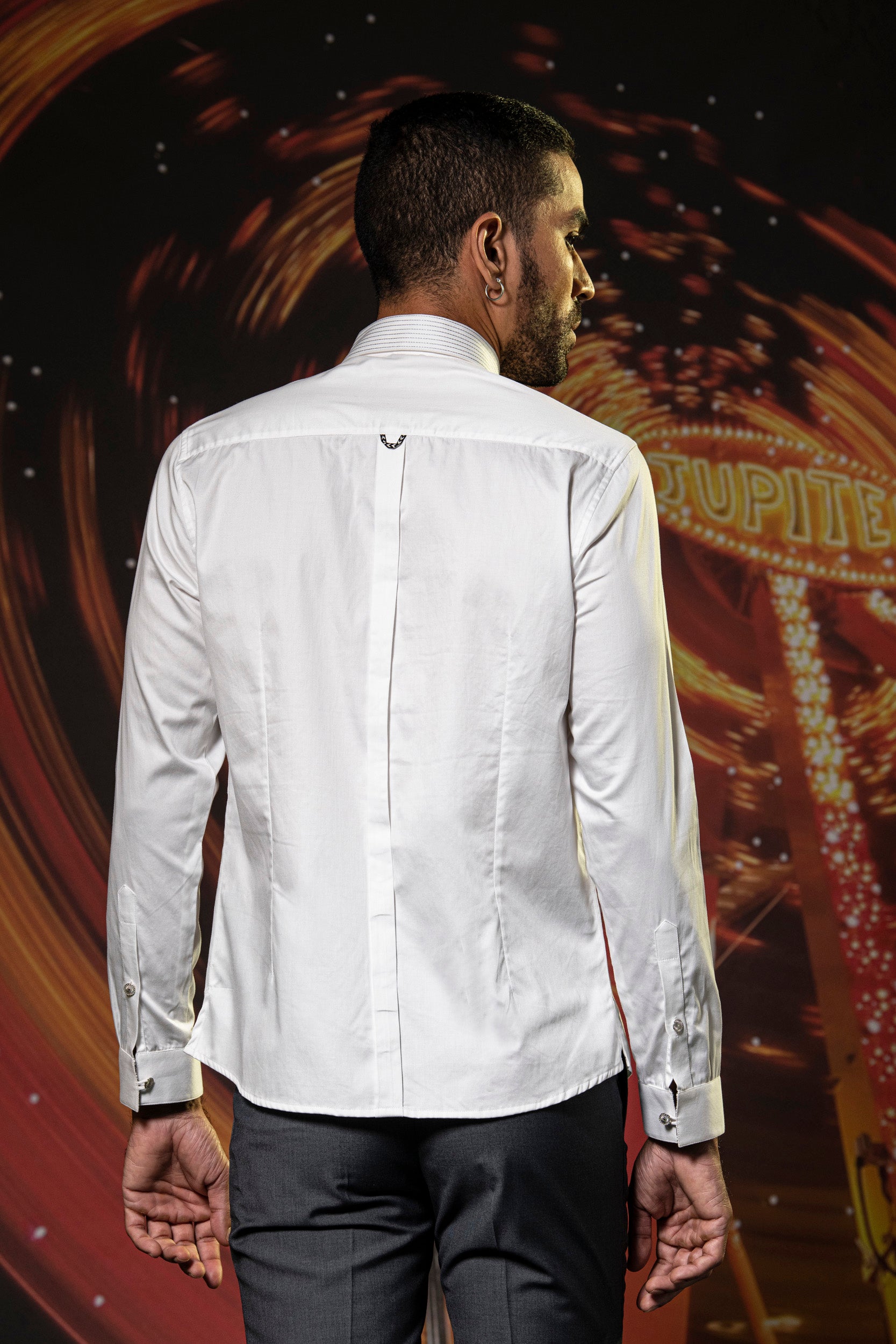 Featuring a white shirt in cotton base with embroidered lines. Perfect wear for parties and cocktail ceremonies.