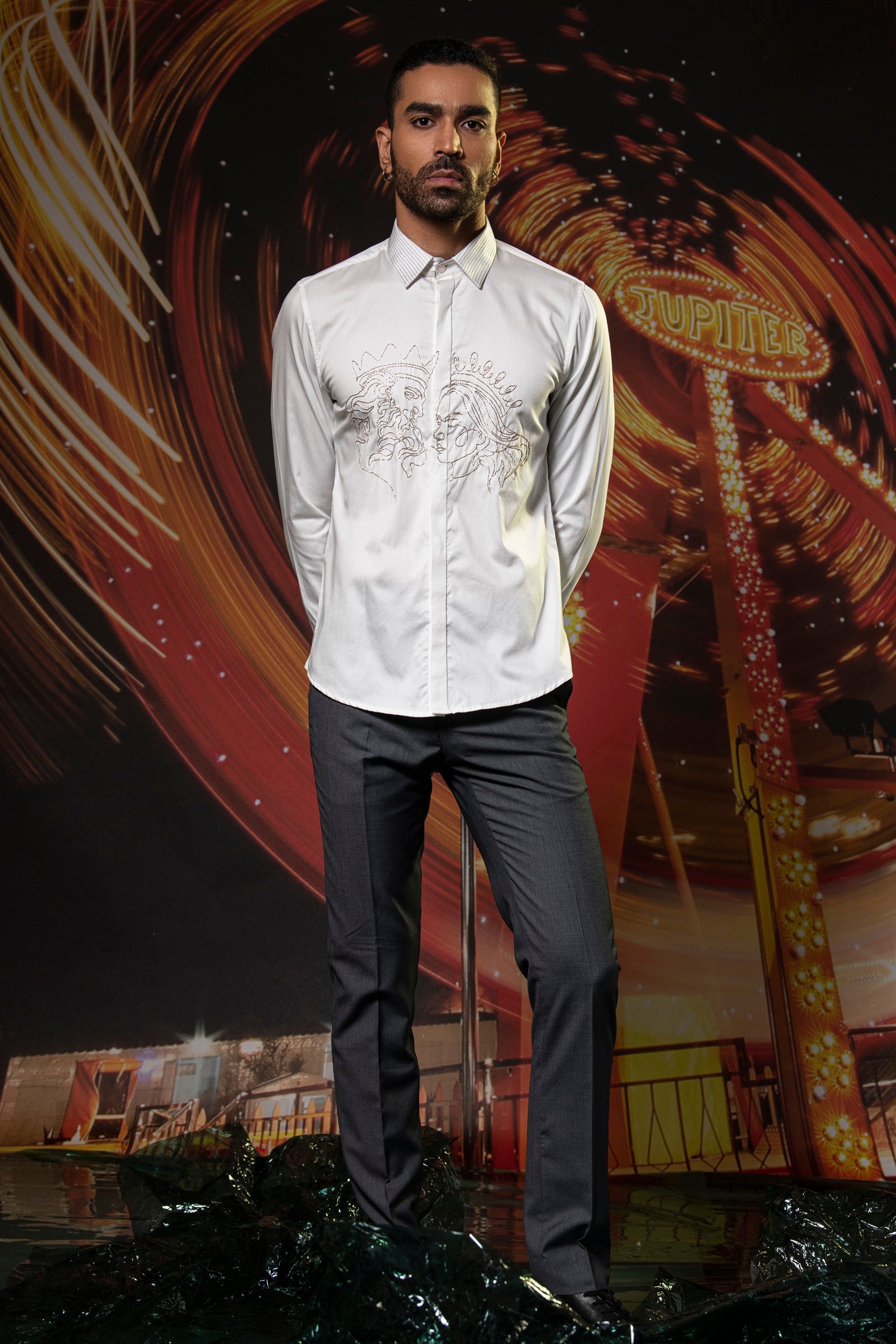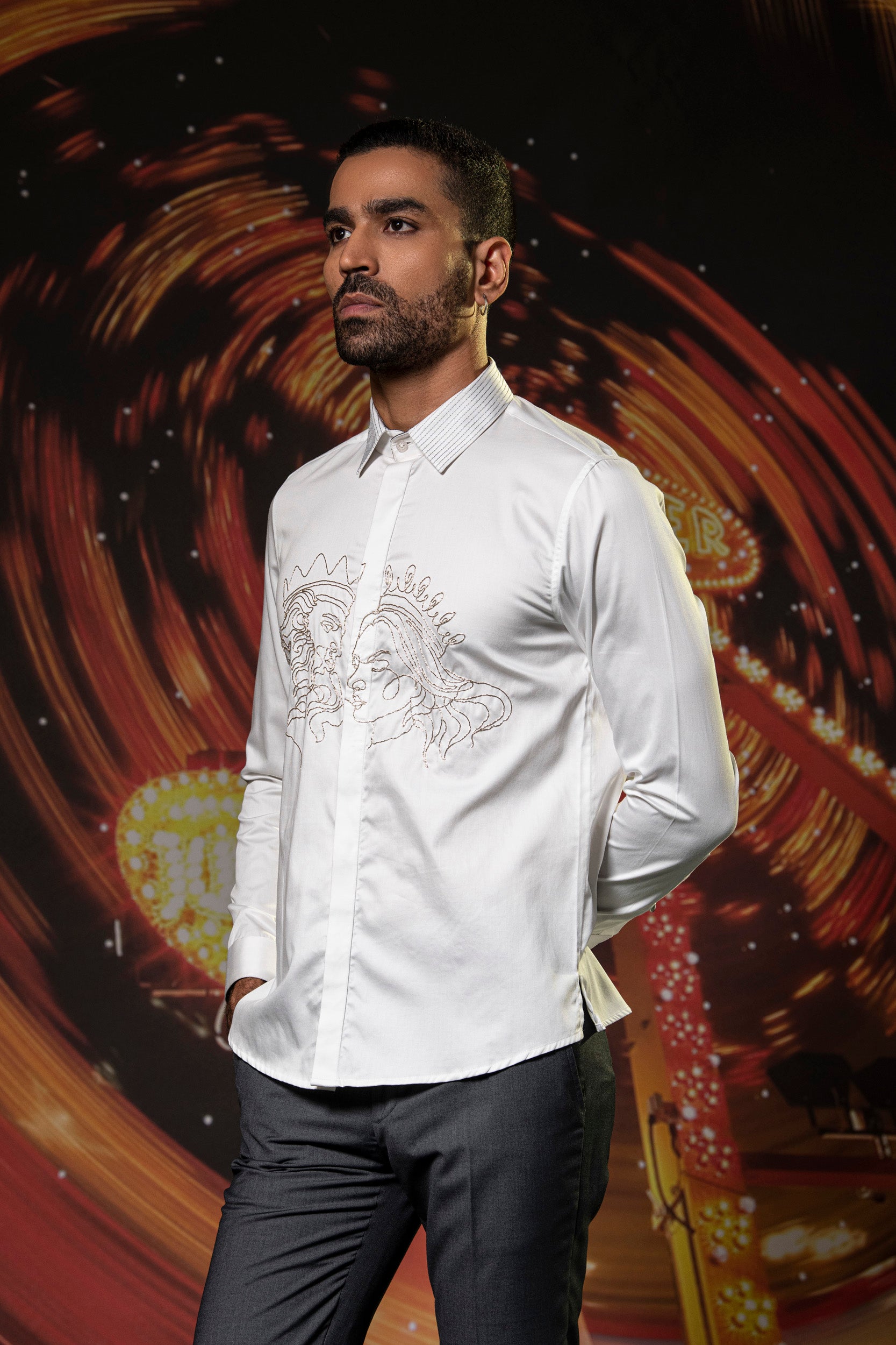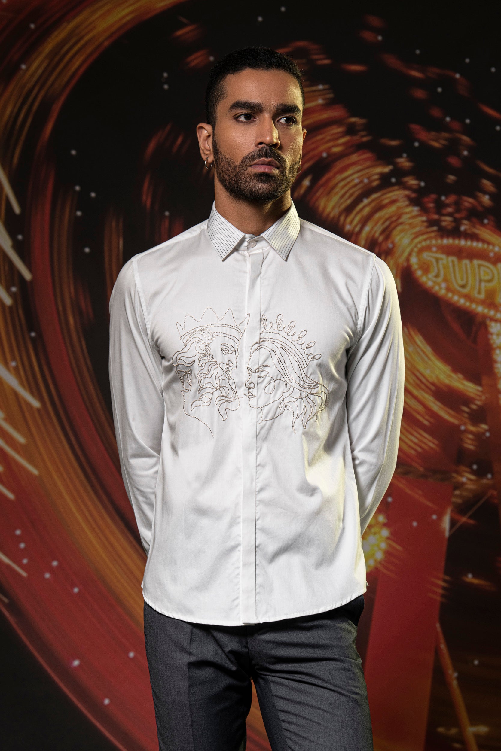 Featuring a white shirt in cotton base with embroidered lines. Perfect wear for parties and cocktail ceremonies.