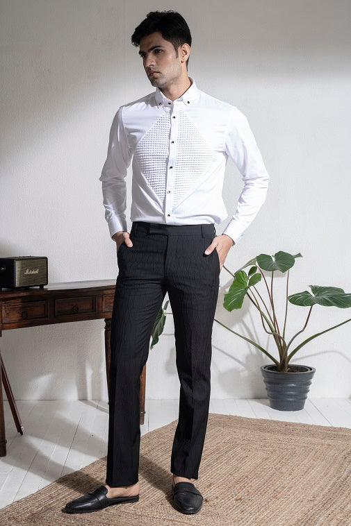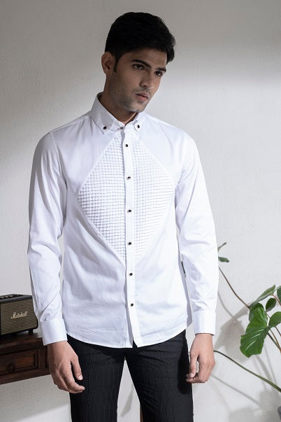 Featuring a white shirt in cotton base with pintucks and button down collar. This contains one piece only
