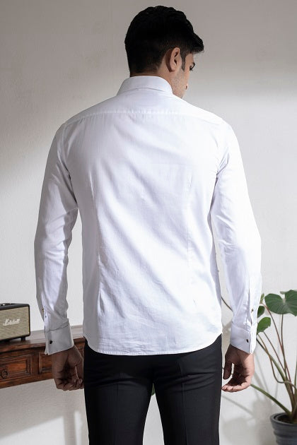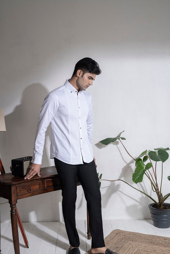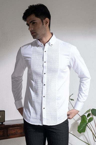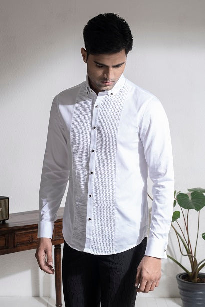Featuring a white shirt in cotton base with pintucks and button down collar . This contains one piece only