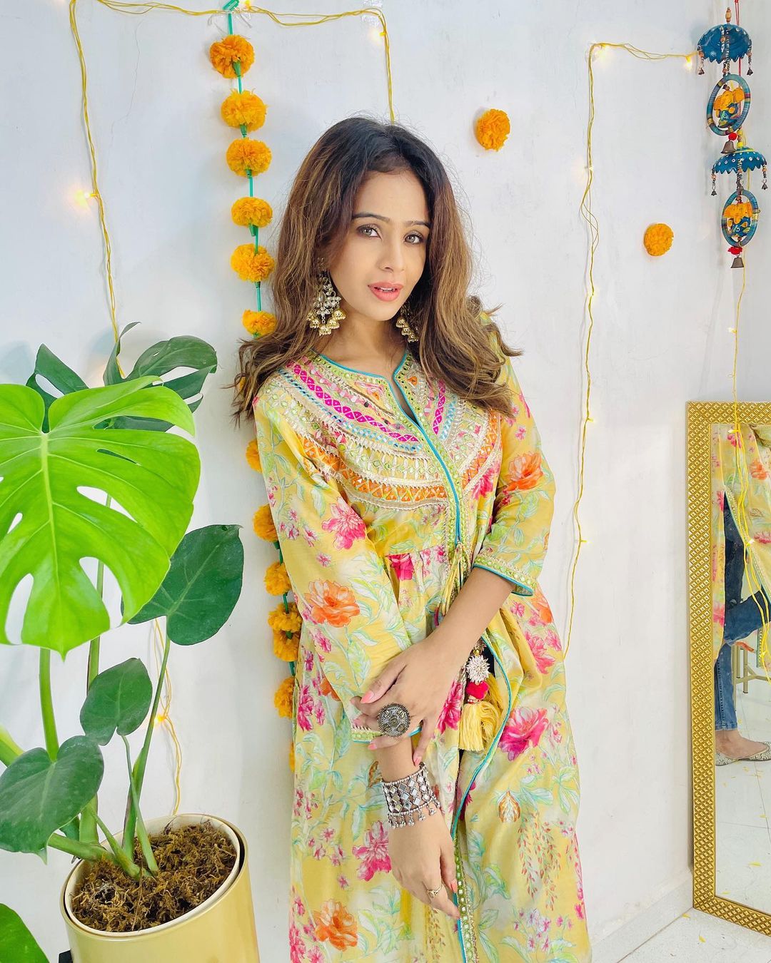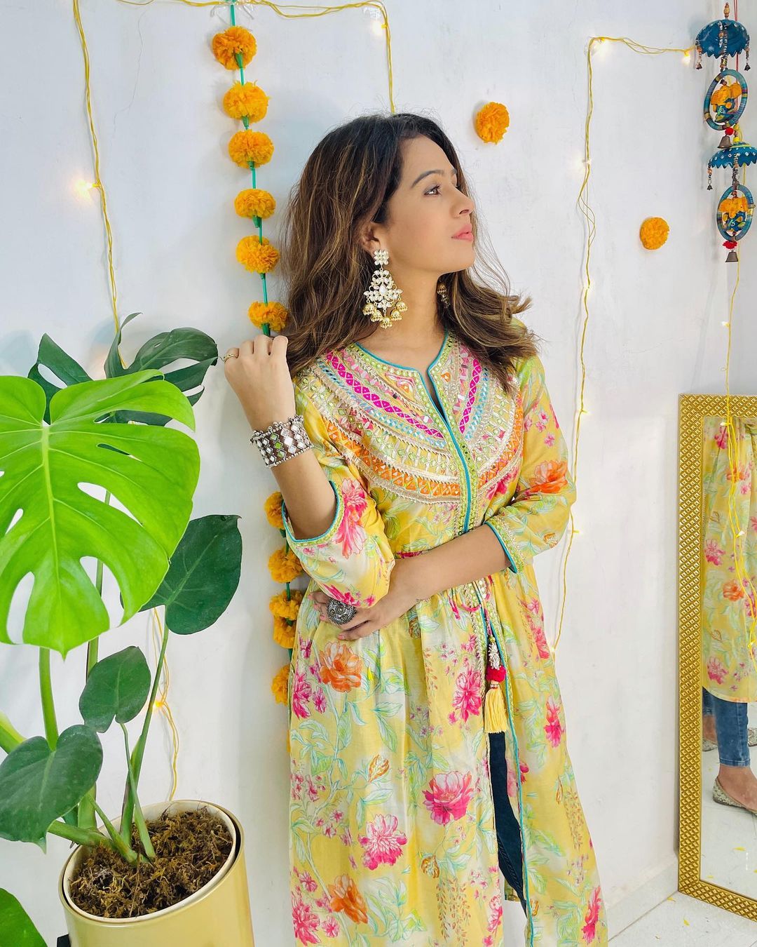 This soft floral, front open tunic has elaborate embroidery, using gota, mirror, silk and bright threadwork. The gathers at the yolk gives a softness and flow to the ensemble.