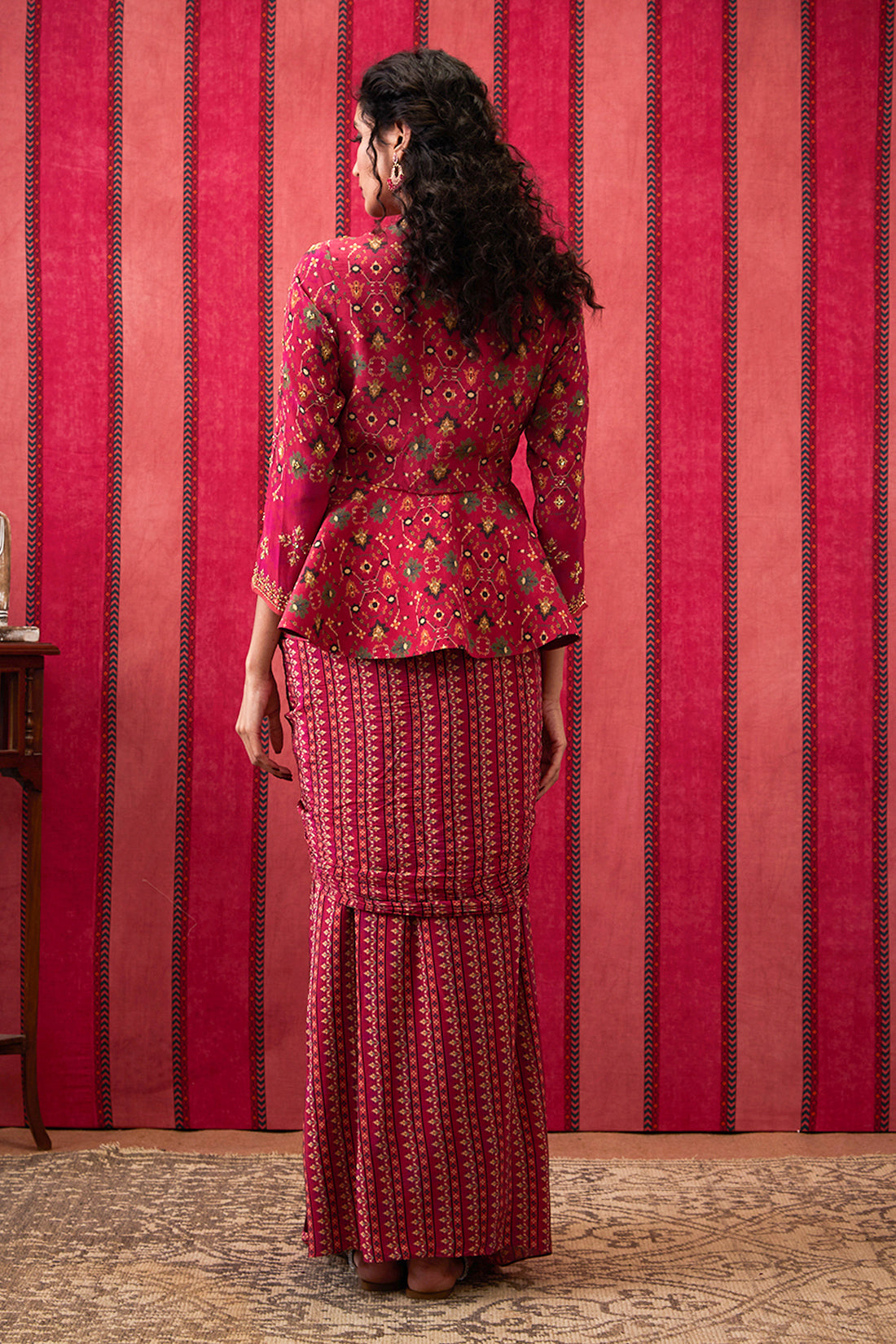 Featuring a Fuchsia pink Drape skirt in crepe fabric. It is paired with a printed peplum jacket.