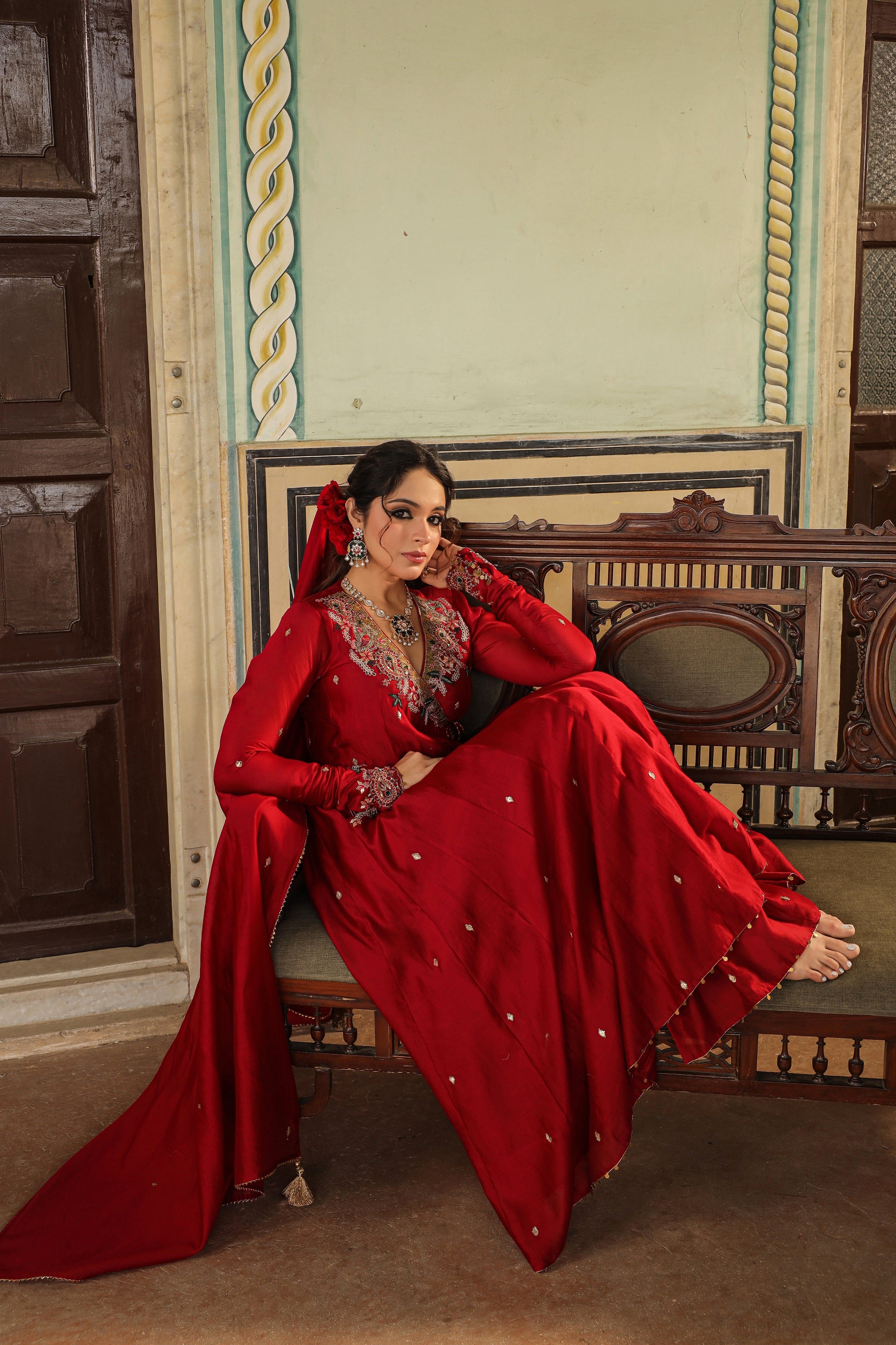 | This 3 pc Angarakha set comes with an embroidered neck with paatra tikkis, kasab and resham paisleys. The chooridaar sleeves are embroidered with an interesting paatra tikki detail for that extra drama. The Angarakha also has Cheent of gota pattis all over. Its paired with a palazzo with golden weave texture & a dupatta with Cheent's of gota patti, tikkis, lace and latkans. |