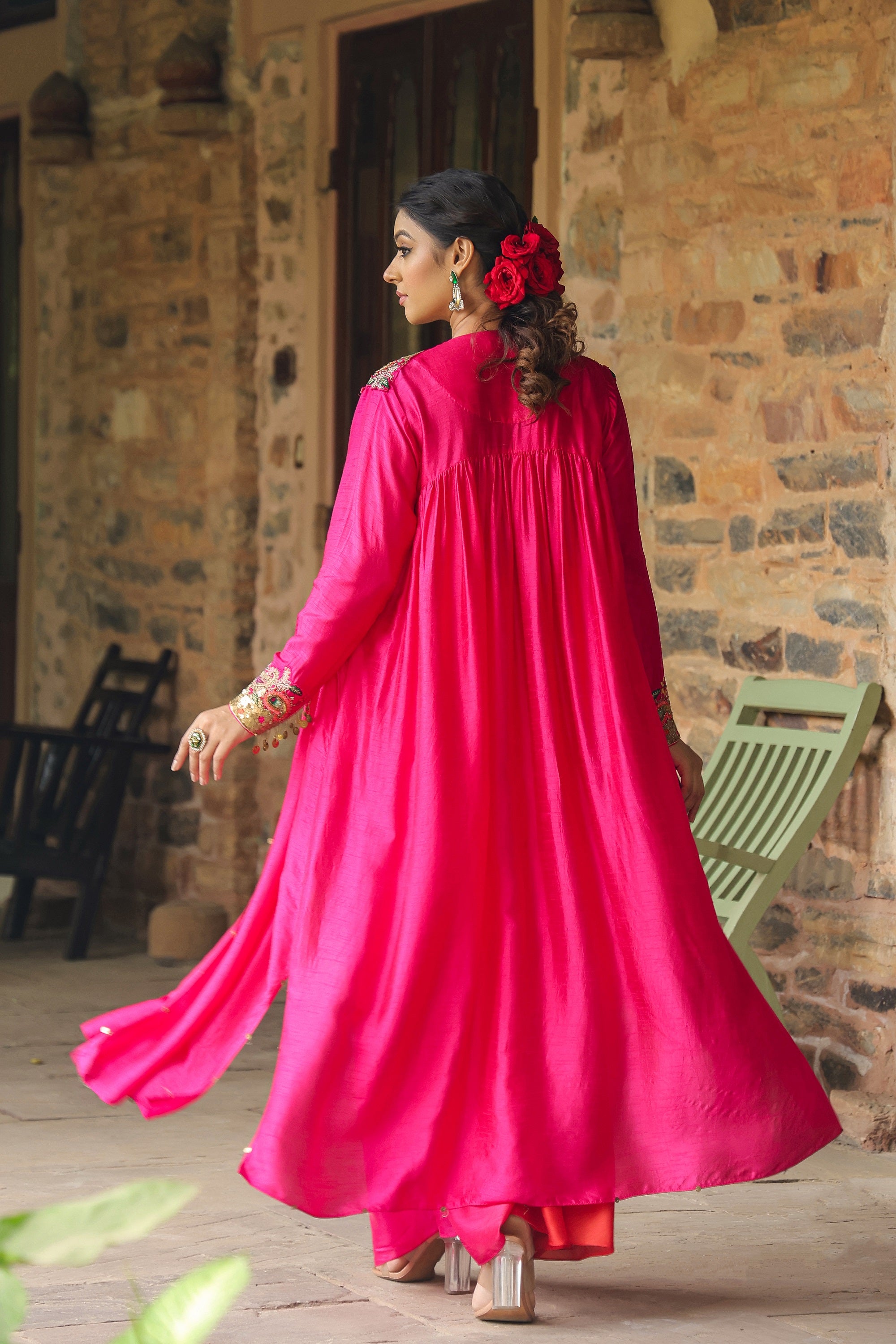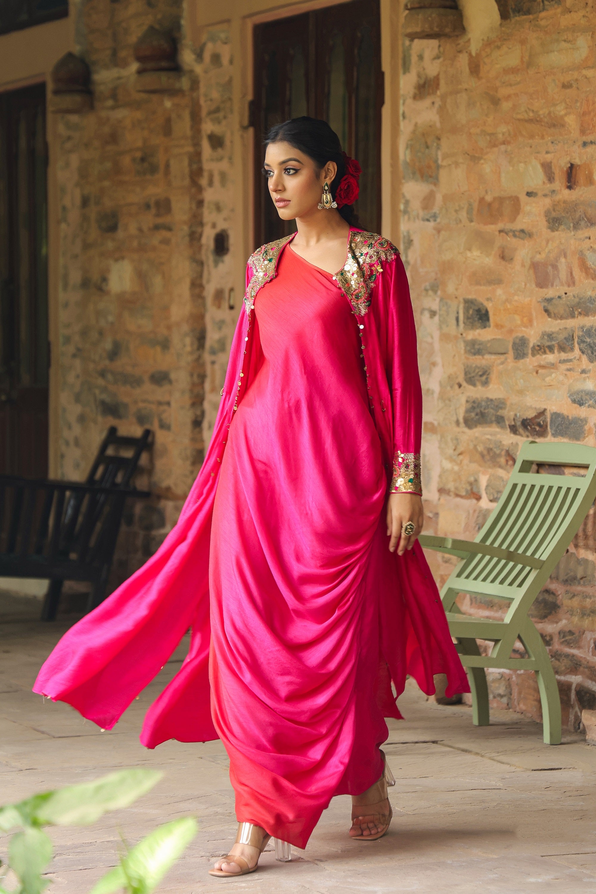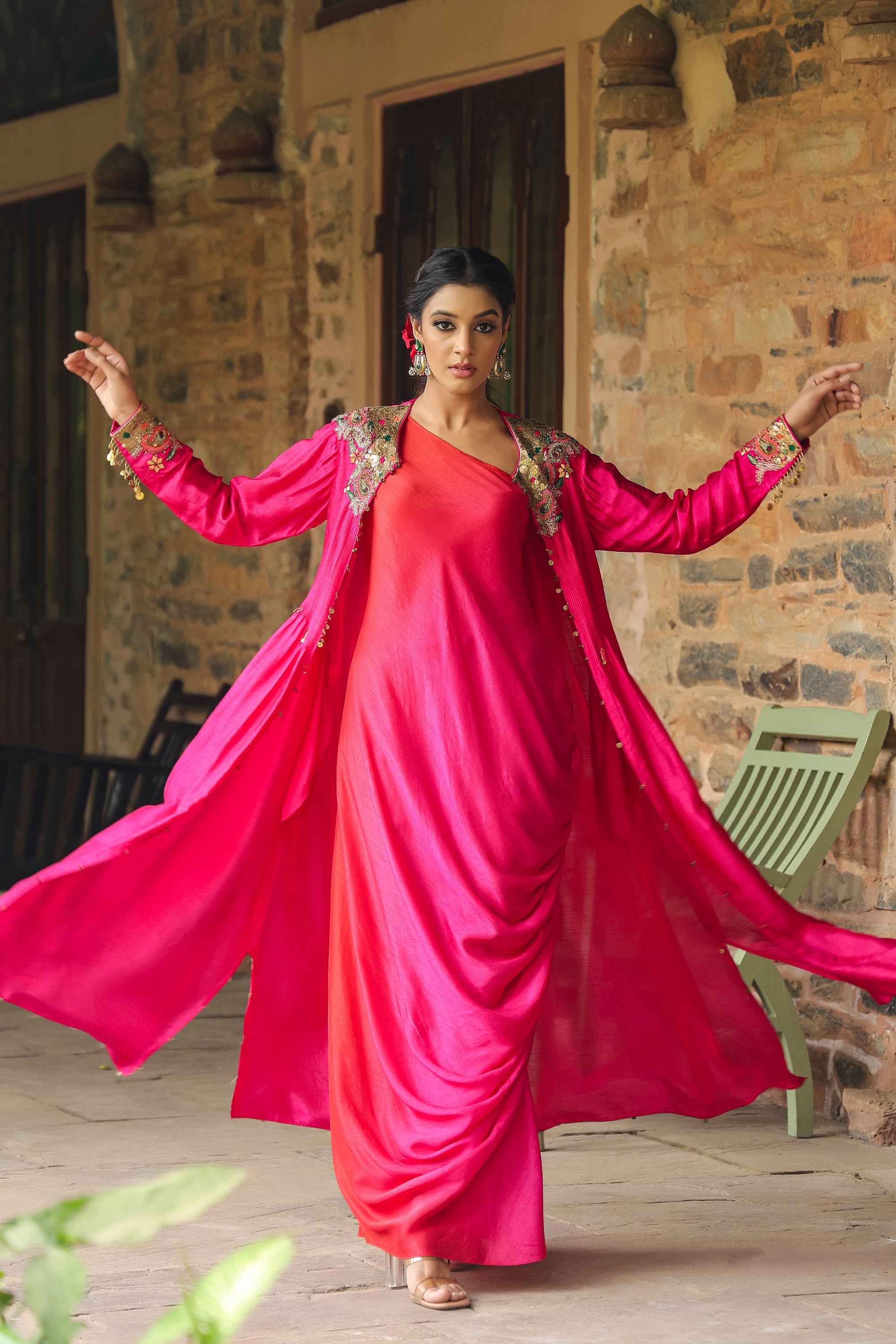 | This 2 pc set comes with a heavily embroidered Jacket worn over a one shoulder ombre cowl dress. The neck of the Jacket is heavily embroidered with paatra tikkis, kasab and resham paisleys with gota flowers. The cuff of the jacket is also embroidered with an interesting paatra tikki detail for that extra drama. |