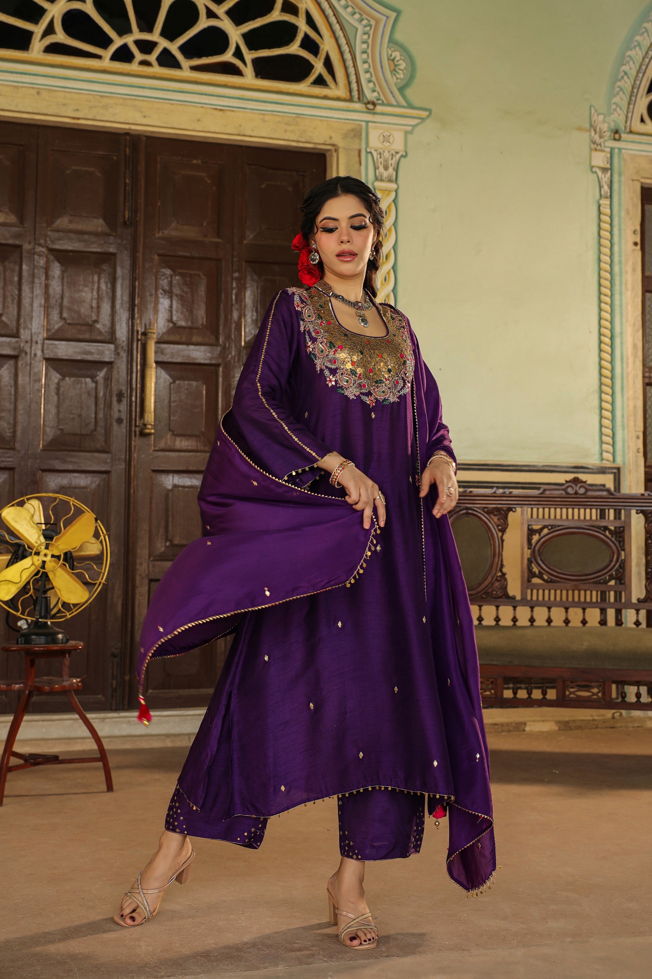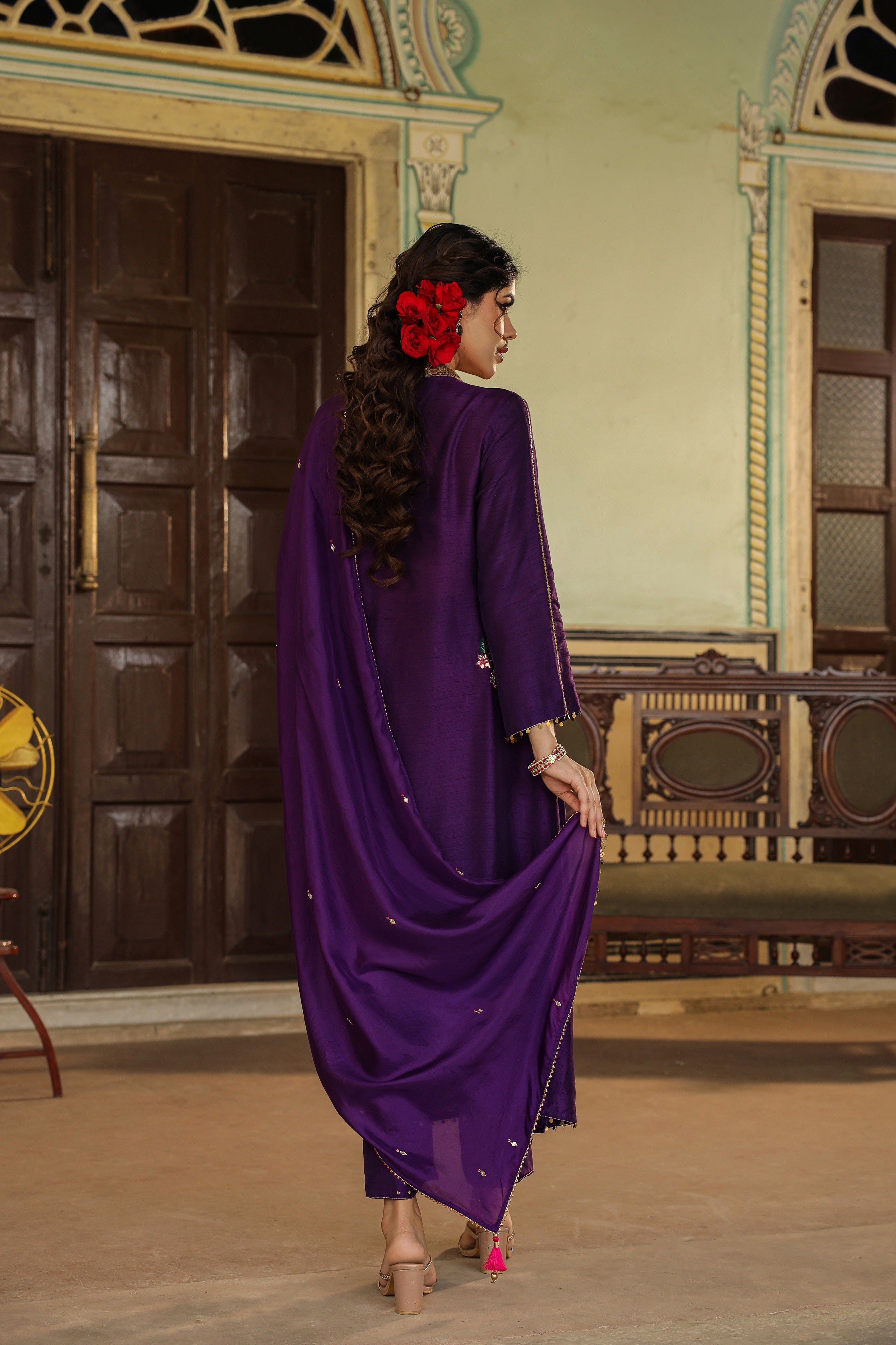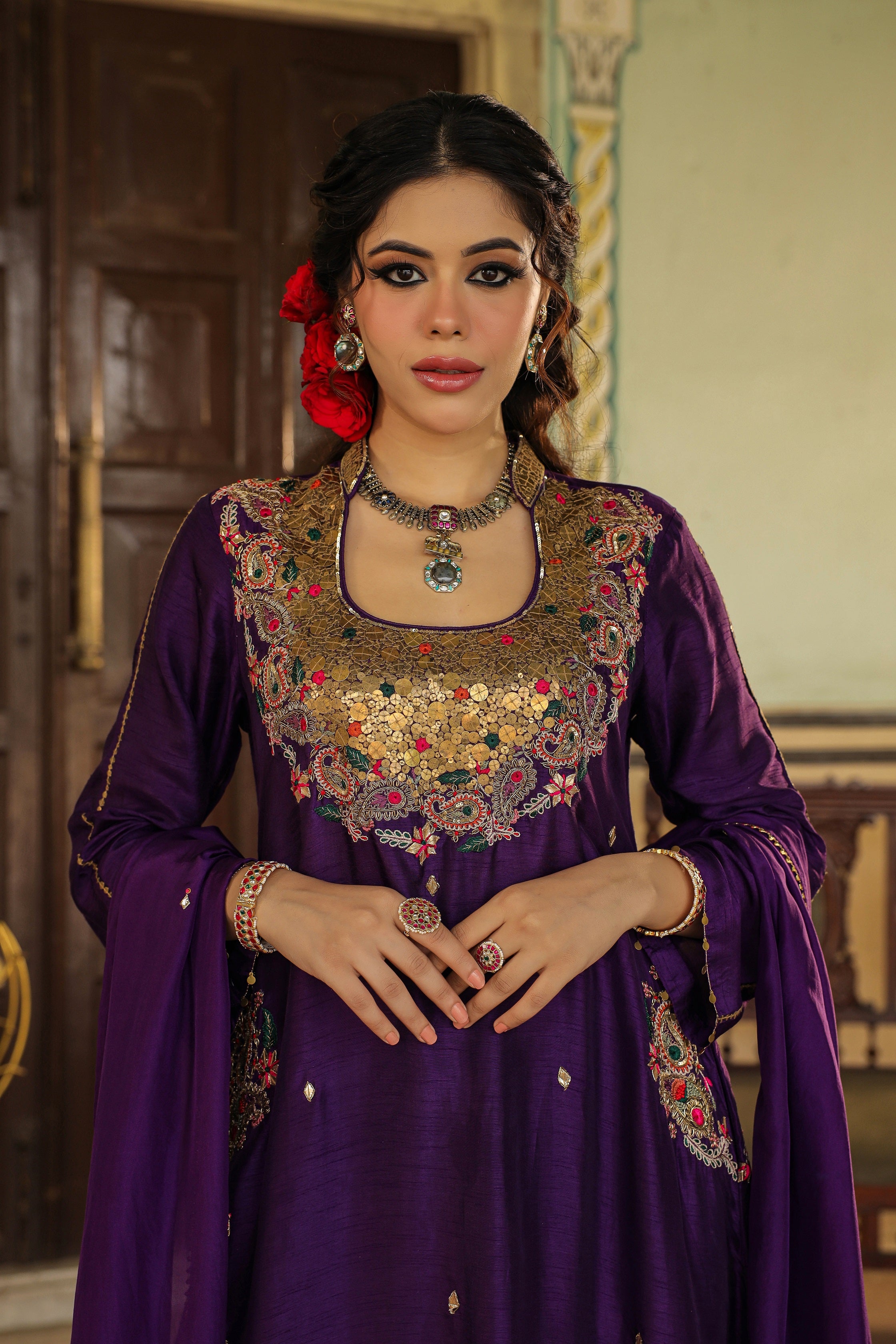 | This 2 pcs Kurta set comes with a Heavily embroidered neck with paatra tikkis, kasab, resham paisleys , gota patti flowers and embroidered pockets. There is a detailing of Paatra tikki on the sleeves, hem line and on the edge of the palazzo. |