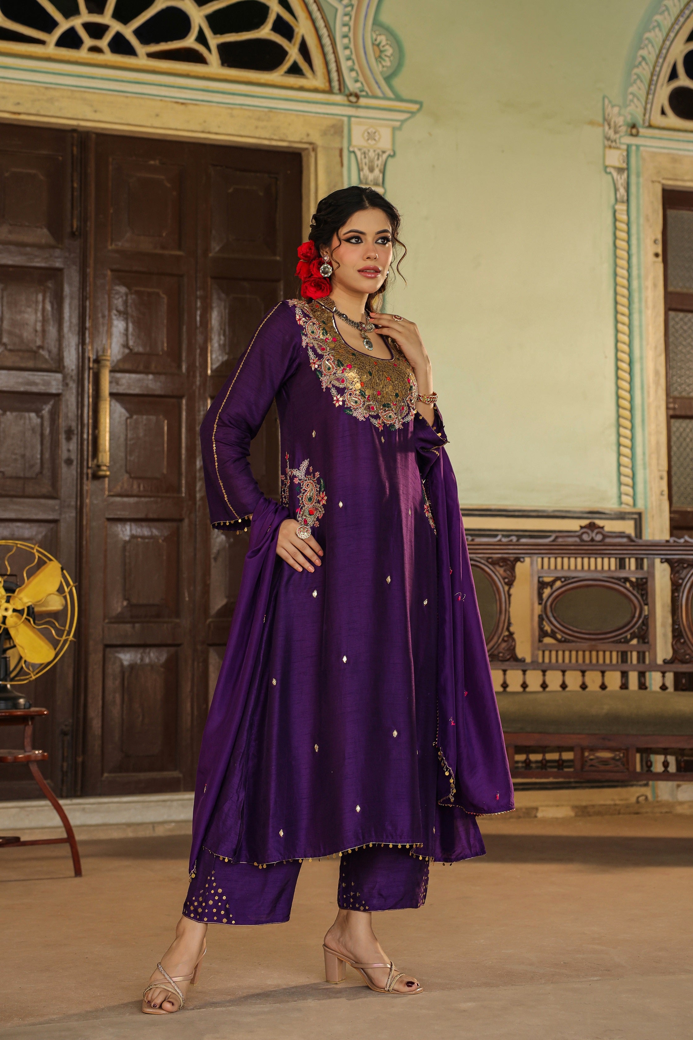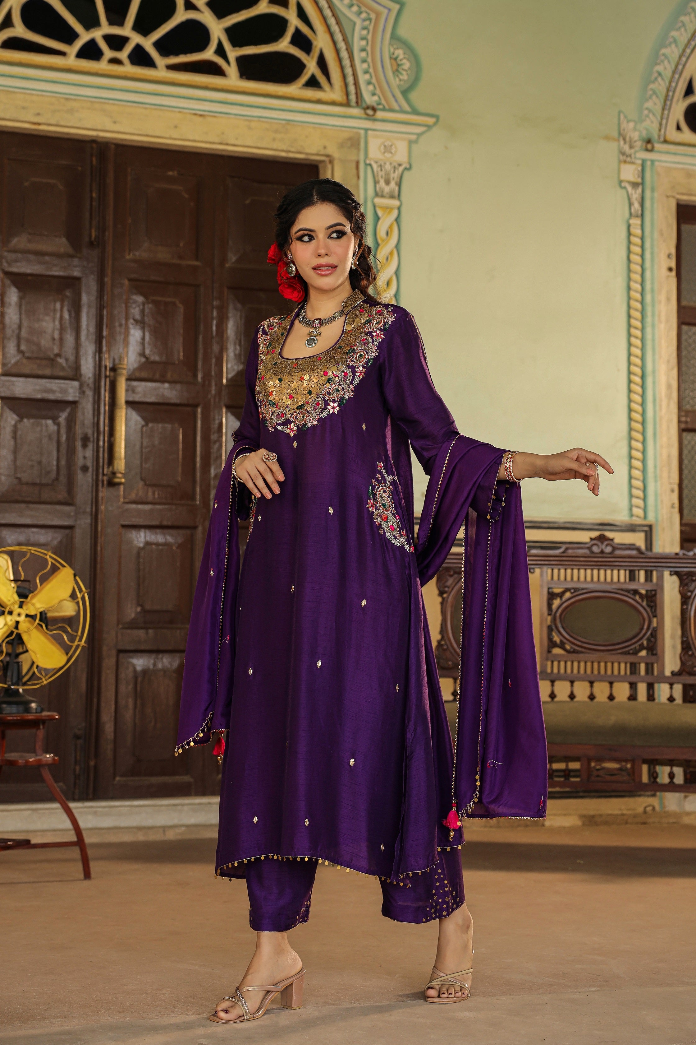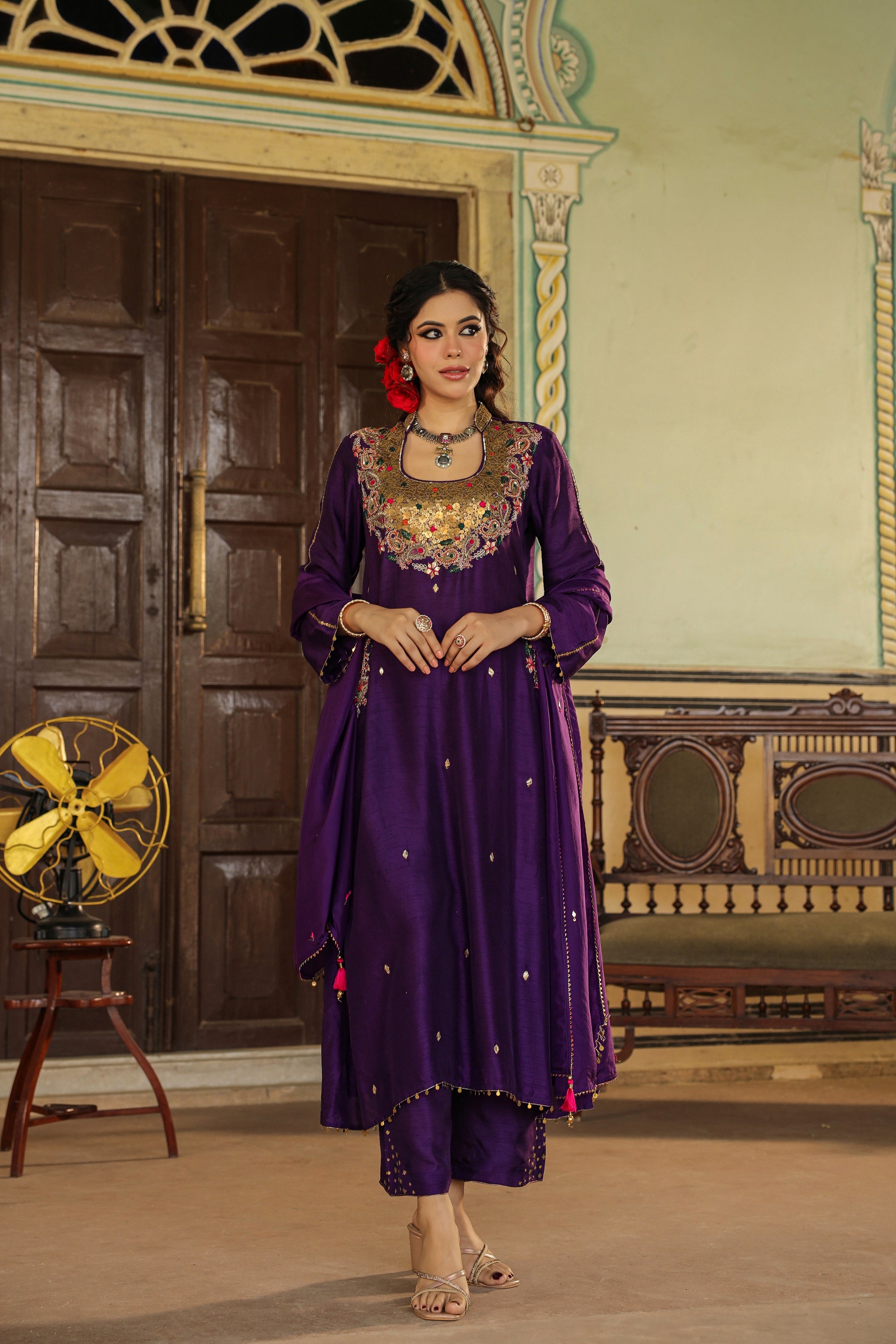 | This 2 pcs Kurta set comes with a Heavily embroidered neck with paatra tikkis, kasab, resham paisleys , gota patti flowers and embroidered pockets. There is a detailing of Paatra tikki on the sleeves, hem line and on the edge of the palazzo. |