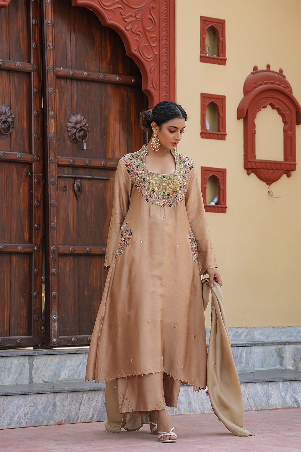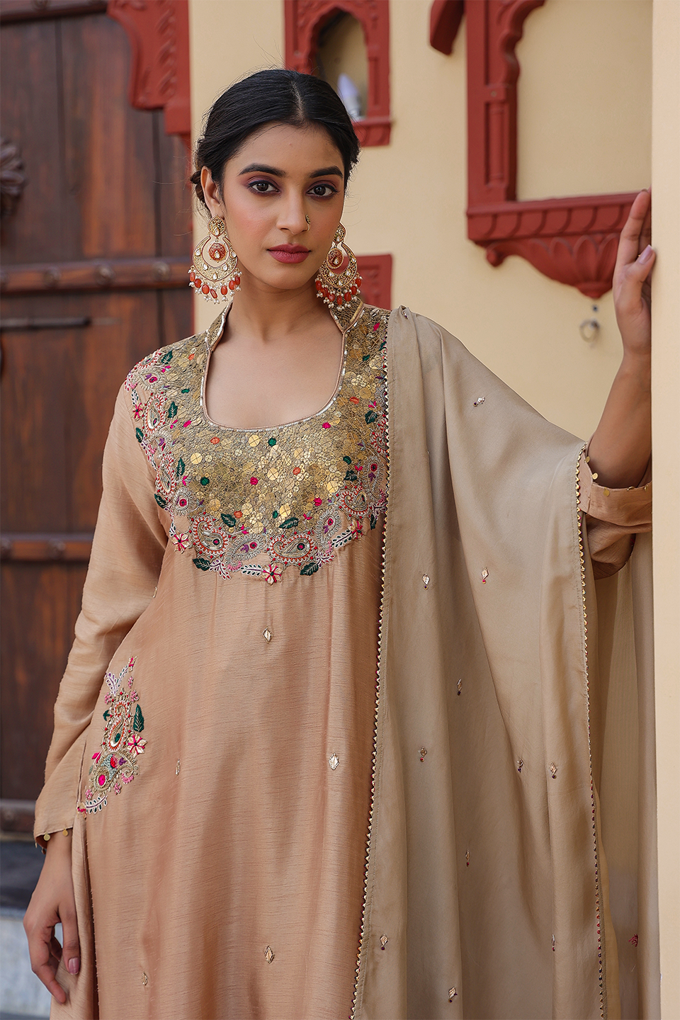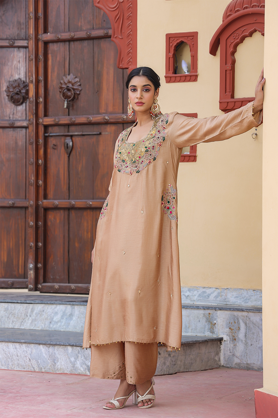| This 2 pcs Kurta set comes with a Heavily embroidered neck with paatra tikkis, kasab, resham paisleys , gota patti flowers and embroidered pockets. There is a detailing of Paatra tikki on the sleeves, hem line and on the edge of the palazzo. |